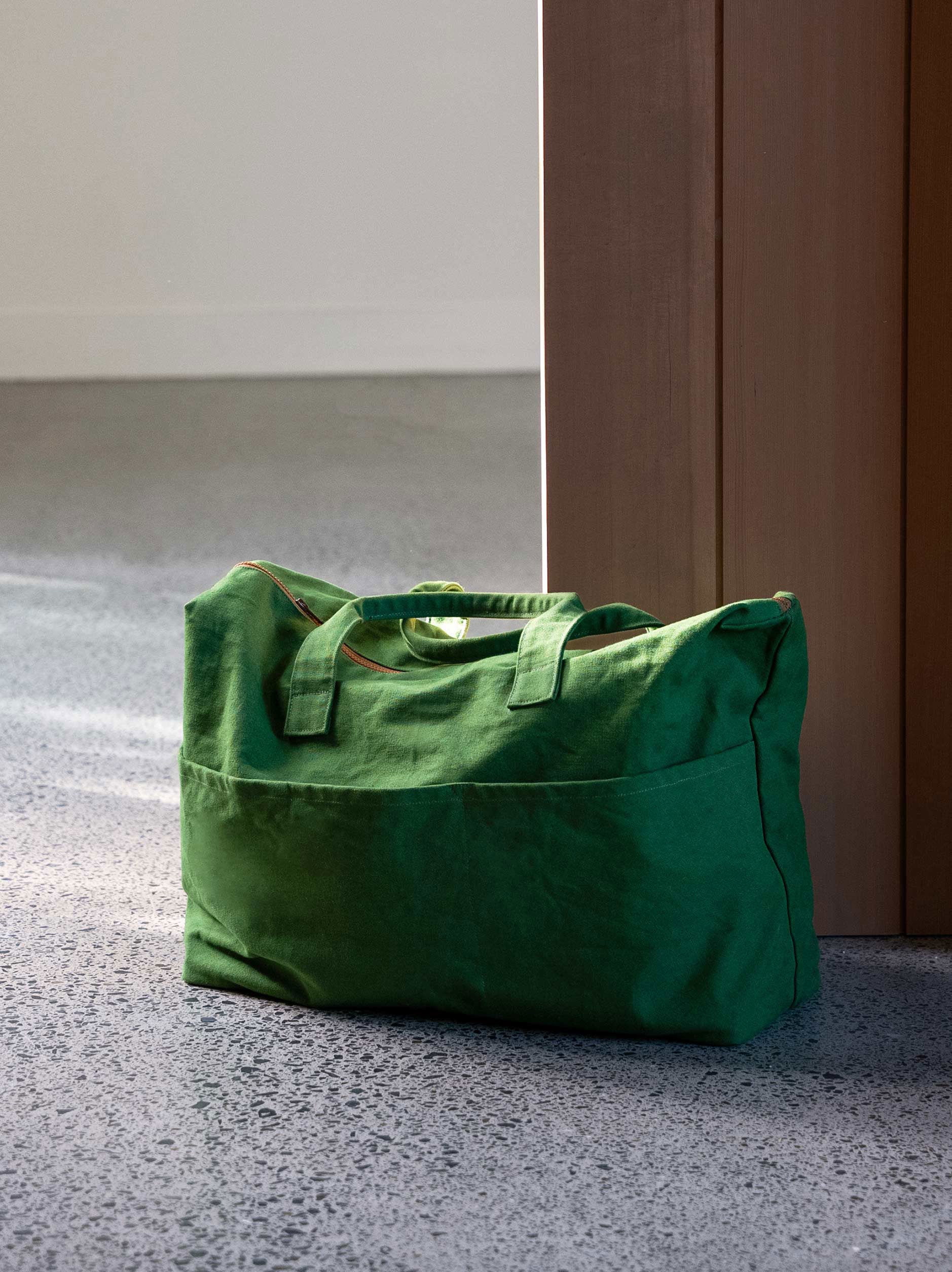 Head out of town with the Marlo overnight bag. The generously sized carryall bag makes a bold color statement with its vibrant spirulina hue contrasting with a warm masala zip.