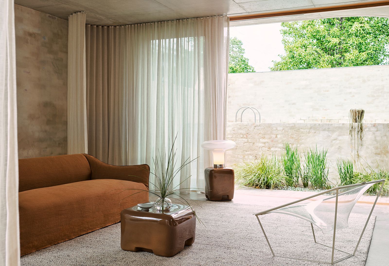 Minimalist living room with a brown sofa, matching side table, modern lamp, glass chair, and sheer curtains. The Meadow Rug - Driftwood by Armadillo&Co adds character as natural light pours in from a large window with views of greenery and stone.