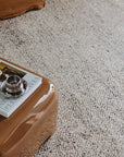 A close-up of the textured beige Meadow Rug - Driftwood by Armadillo&Co beside a brown glossy table with a book and metal candle holder in a cozy indoor setting.