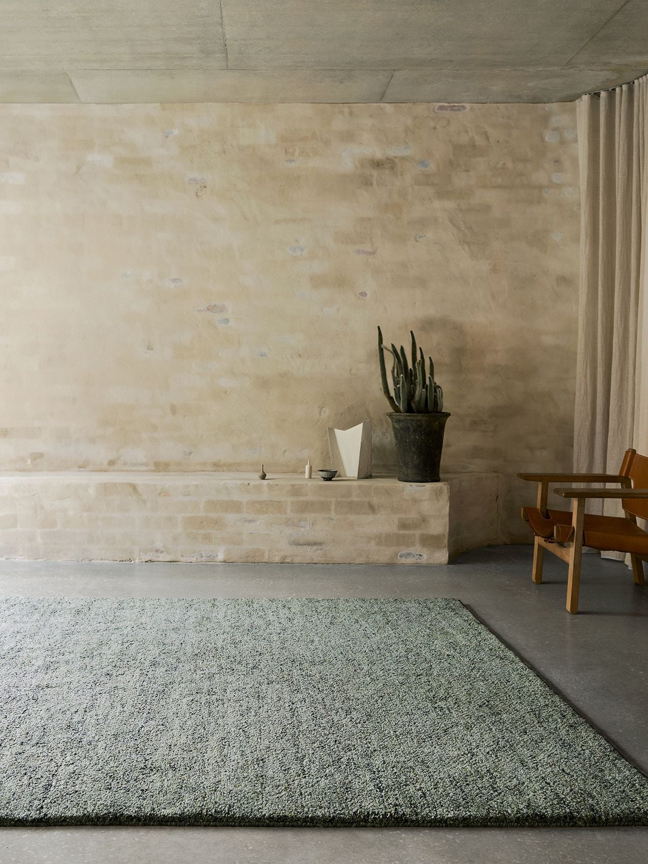 A minimalist room with a light brick wall, an Armadillo&Co Meadow Rug in Seagrass on a concrete floor, a potted cactus, a wooden chair, and neutral-toned curtains in the corner.