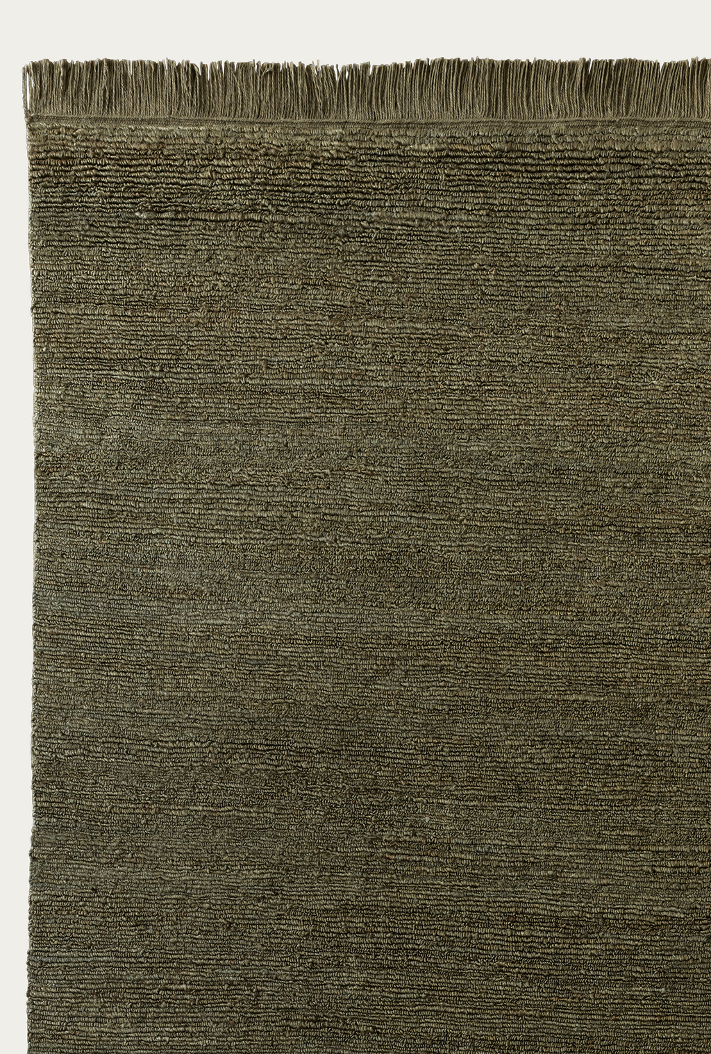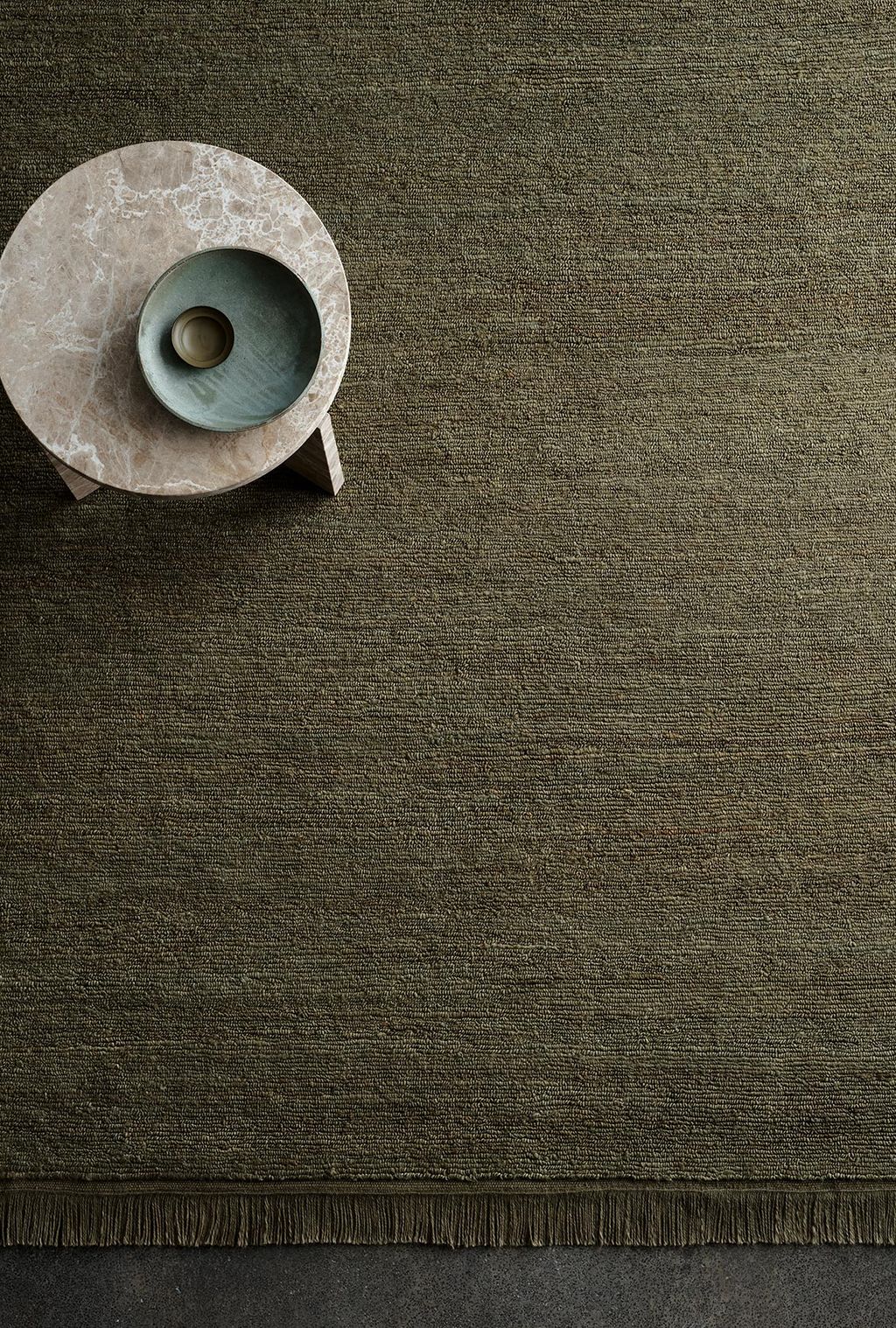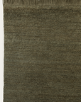 A rectangular Mojave Rug - Laurel by Armadillo&Co in olive green features a smooth, subtly textured surface with short fringe along the ends, reflecting the brands signature style.