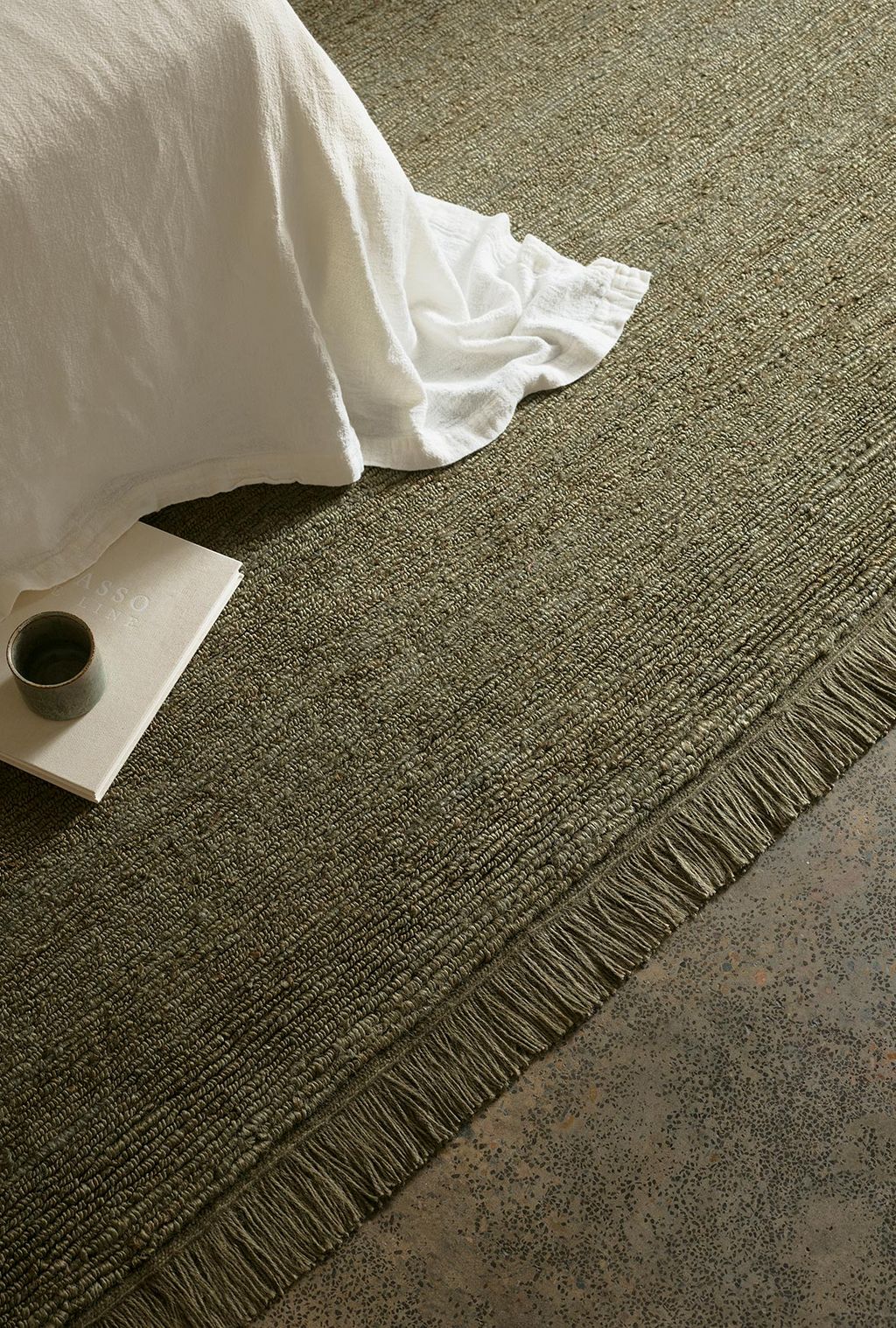 A textured green Mojave Rug - Laurel by Armadillo&Co with fringe edges sits on a speckled floor. A white blanket drapes over the bed onto the rug, with a cup and book resting beside it.
