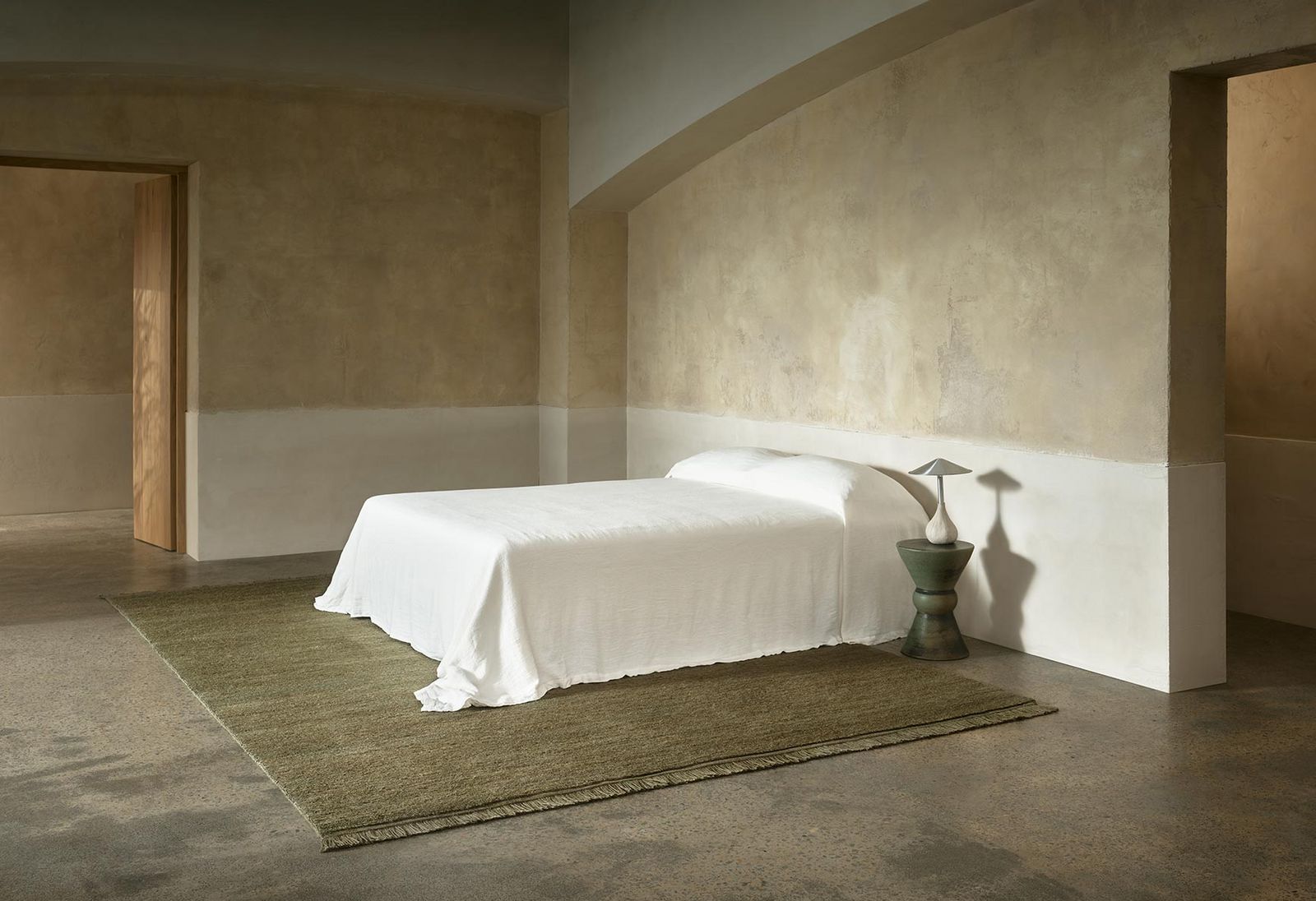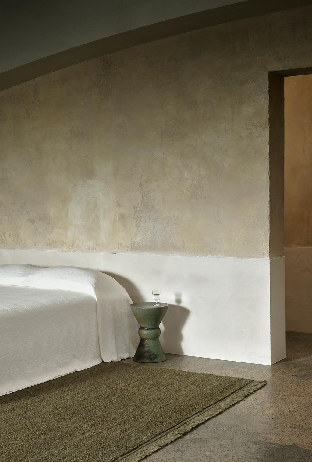 A minimalist bedroom with a bed in white sheets, a small green side table, a textured beige wall, and an Armadillo&Co Mojave Rug - Laurel on the polished concrete floor.