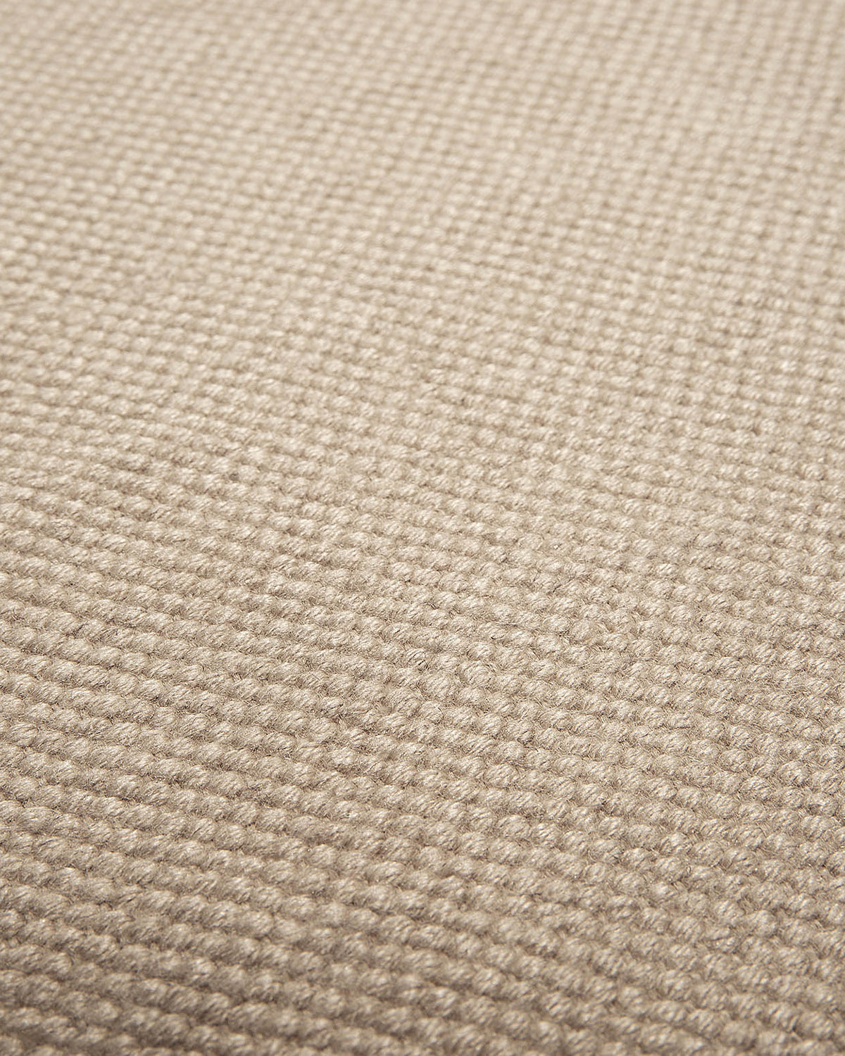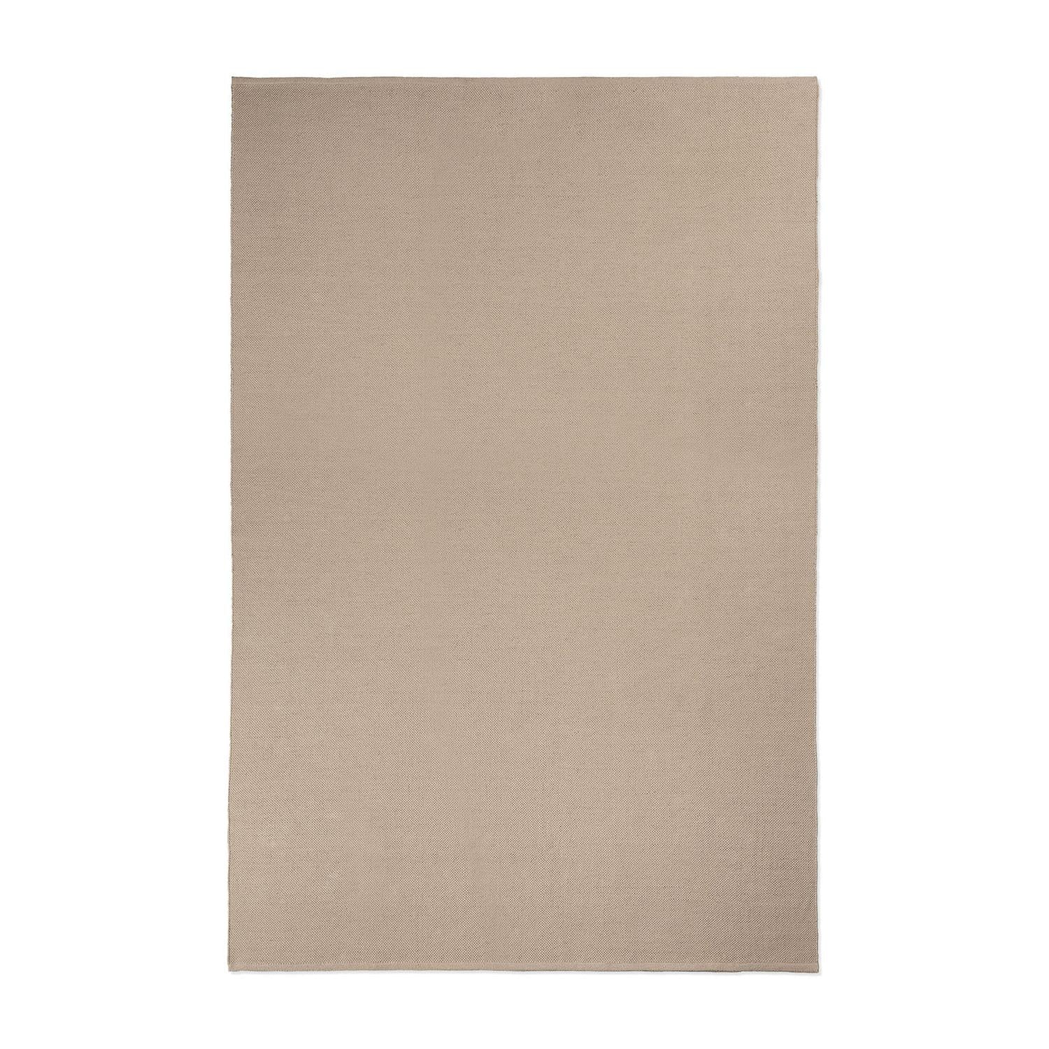A close-up of the Ethnicraft Nomad Outdoor Rug shows its beige woven fabric, crafted from recycled PET yarns for a subtle textured pattern and finished edges, photographed against a white background.