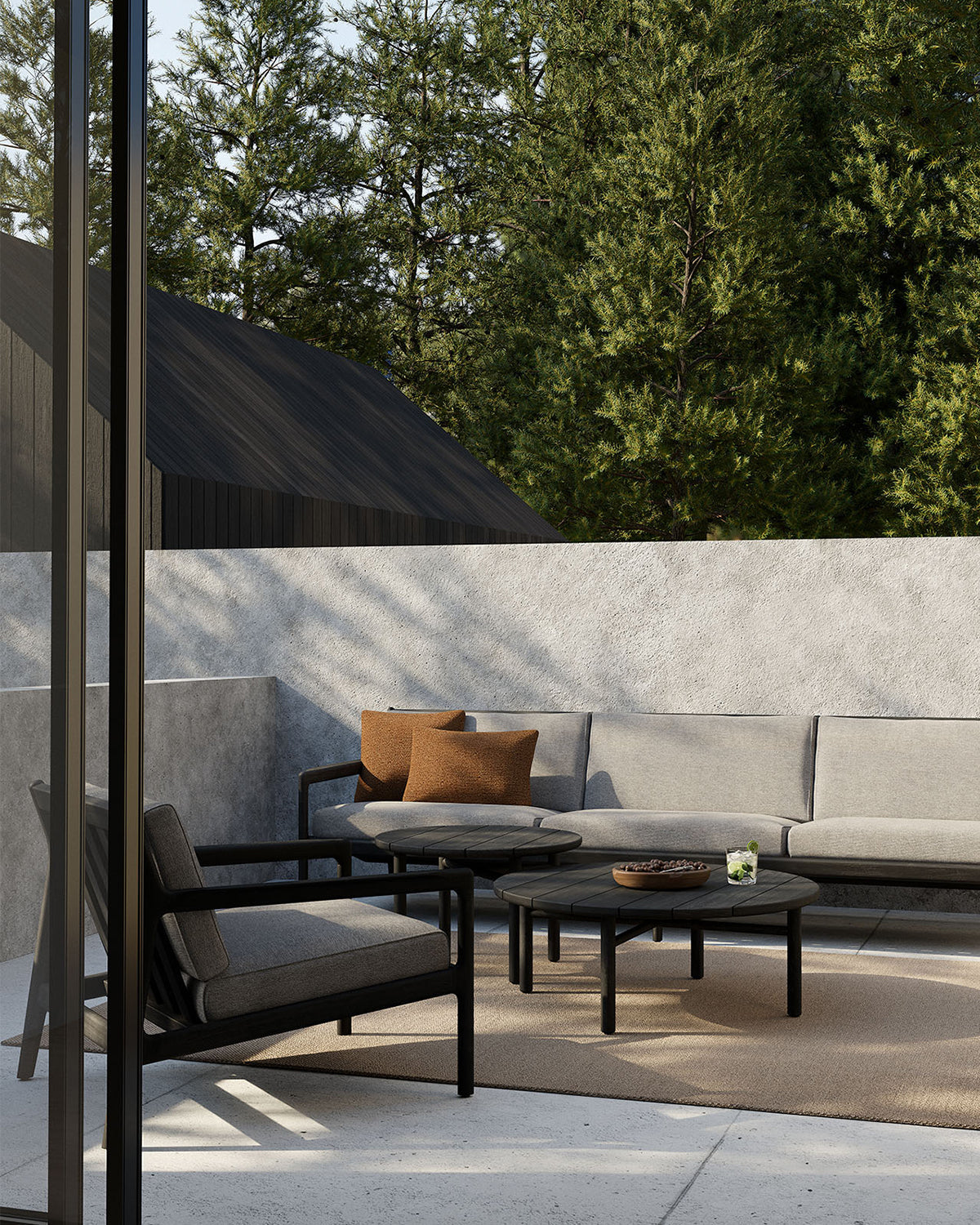 Modern patio with gray cushioned seating, black metal frames, and a round black coffee table. The Ethnicraft Nomad Outdoor Rug, made from recycled PET yarns, complements brown accent pillows in the Ethnicraft Outdoor Collection.