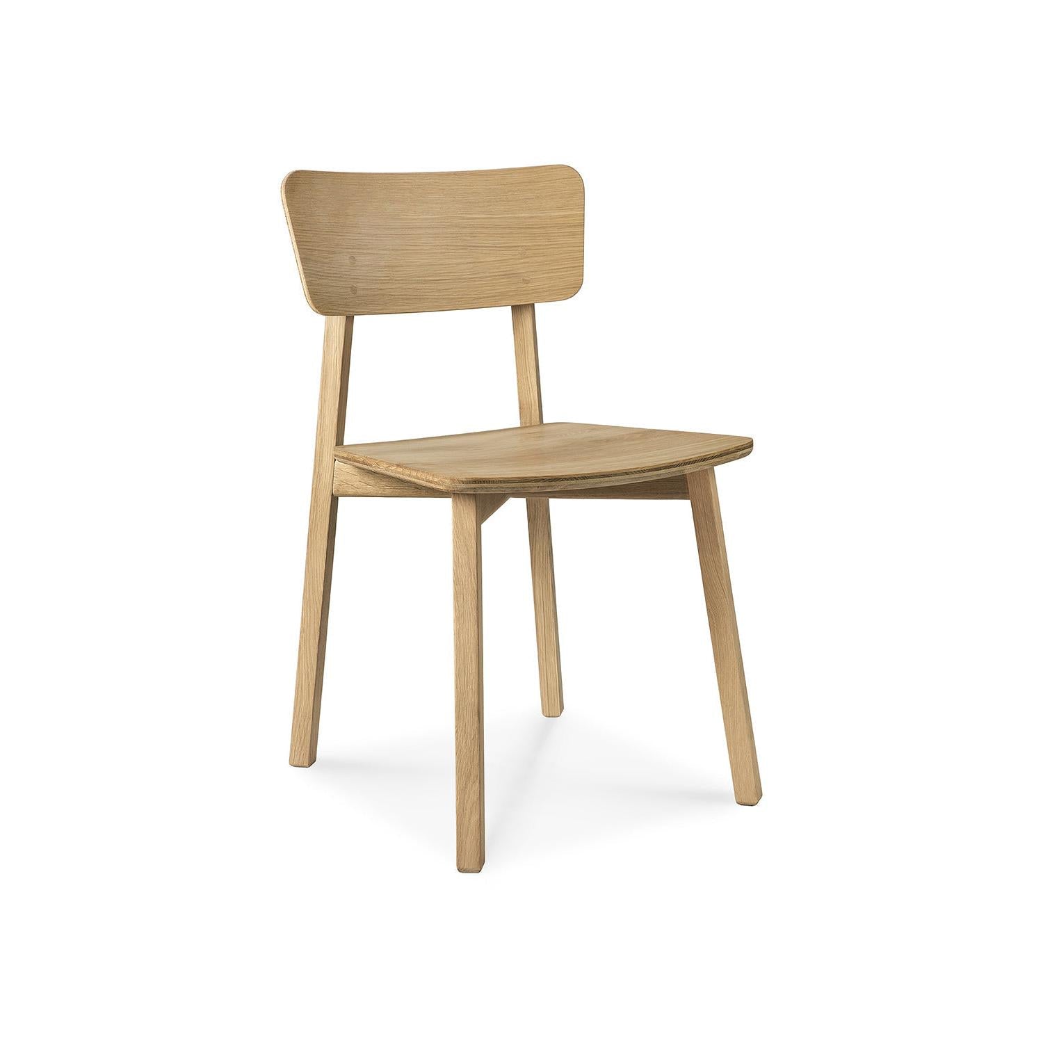 The Casale Dining Chair by Ethnicraft features light European oak, a flat seat, angled legs, and a subtly curved backrest, offering classic refinement against a white background.