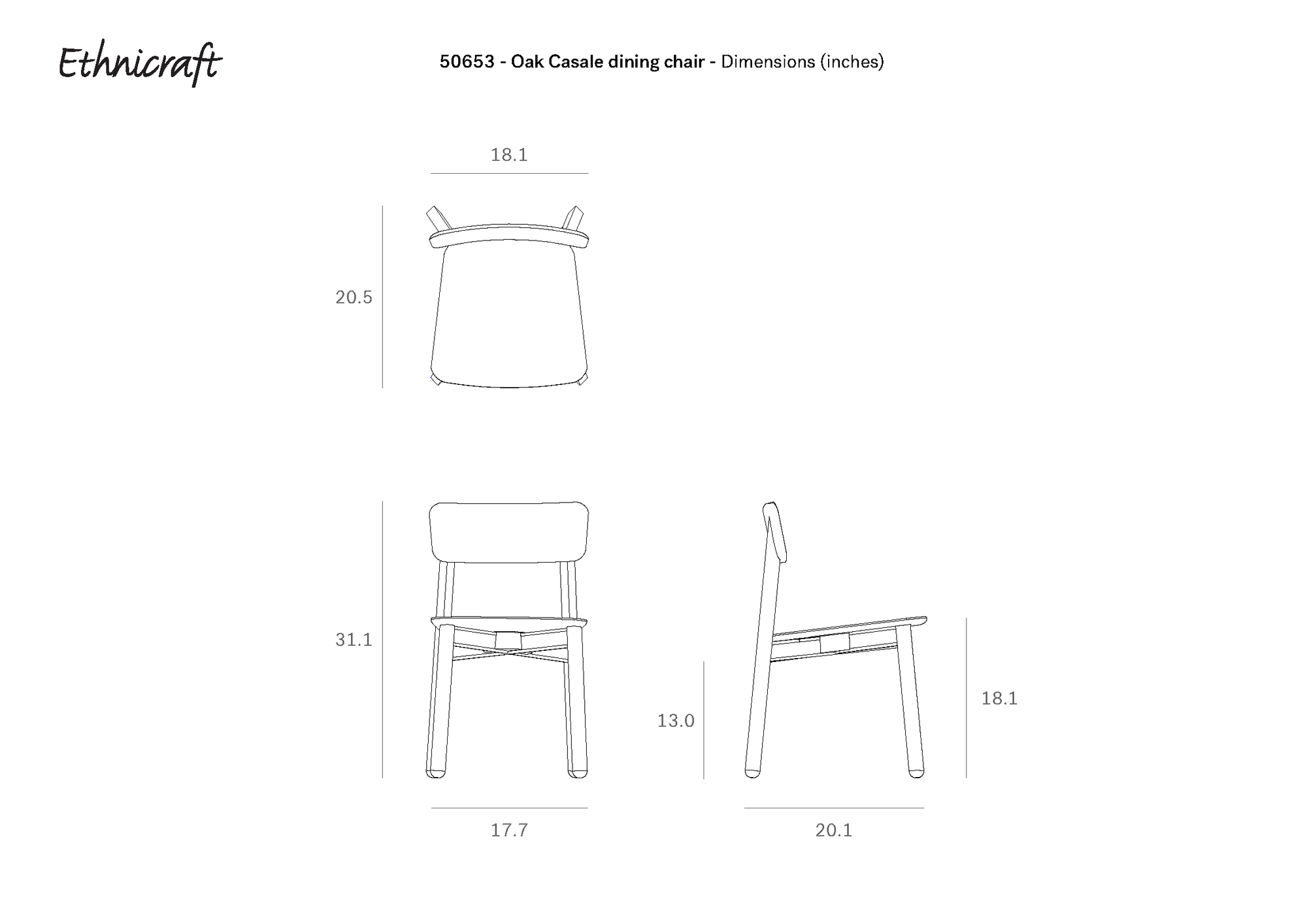 Line drawings of the Ethnicraft Casale Dining Chair - Oak from top, front, and side views, crafted in European oak. Dimensions: H31.1, SH18.1, W17.7, D20.1, backrest H20.5, seat D13.0. Classic European refinement style.