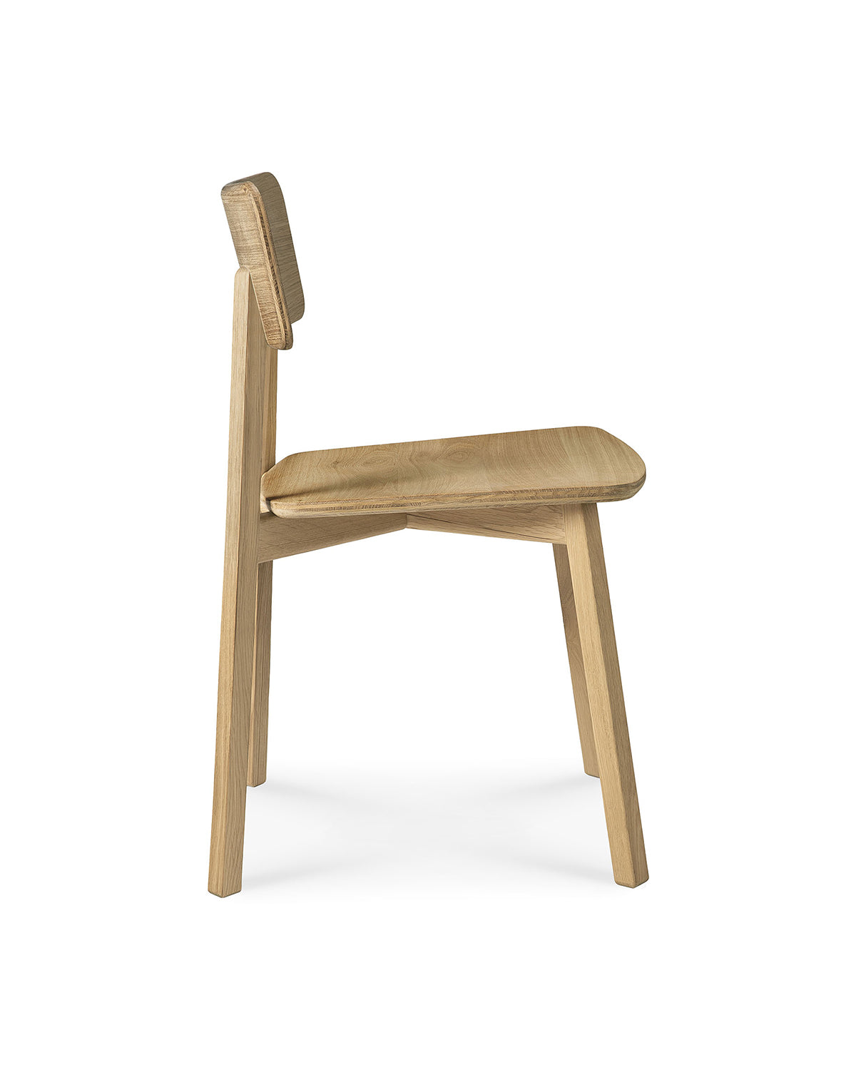 A close-up side view of the Ethnicraft Casale Dining Chair - Oak featuring a minimalist design with a flat seat, angled legs, and a rectangular backrest crafted from light European oak, set against a plain white background.