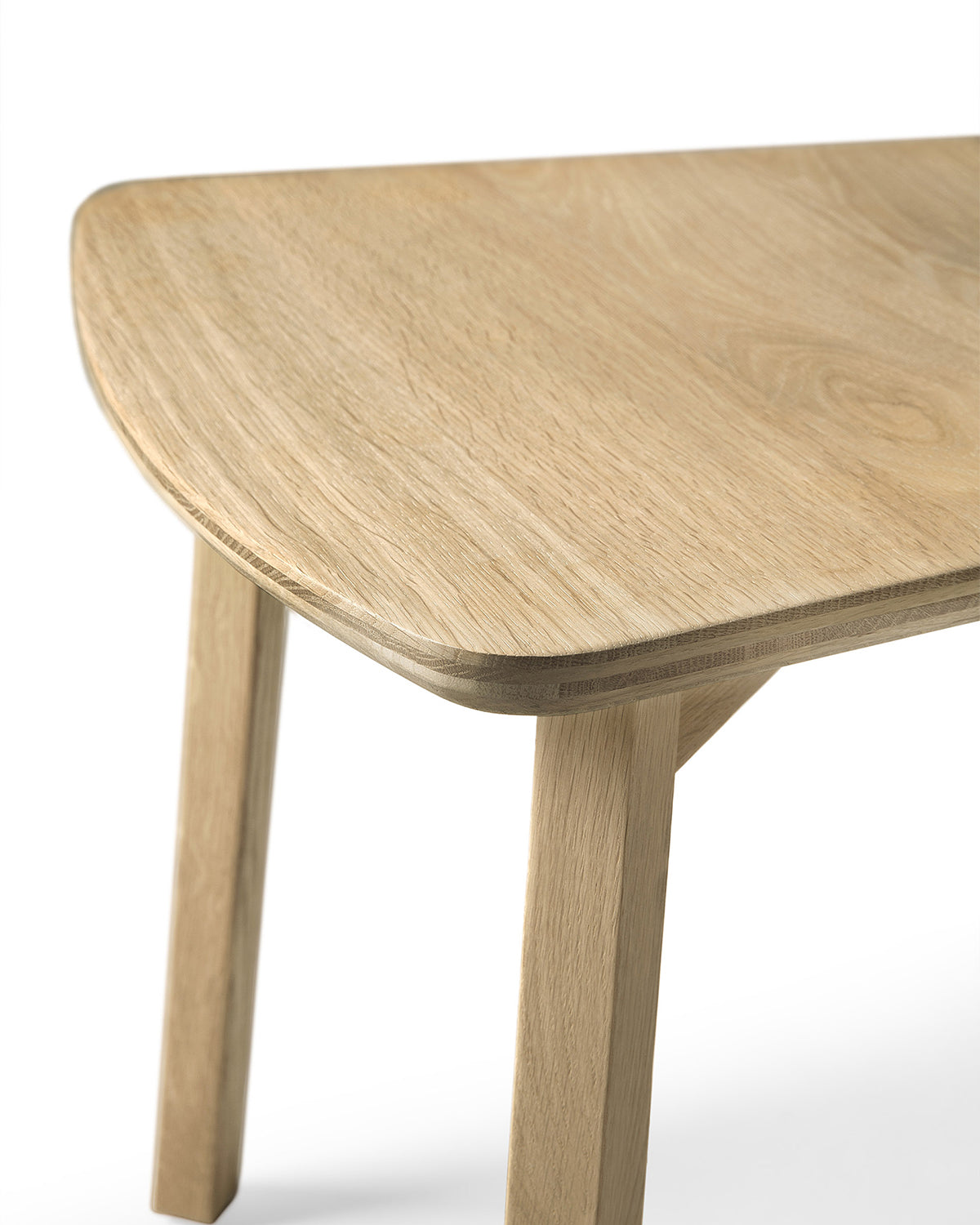 Close-up of the Casale Dining Chair - Oak by Ethnicraft, highlighting classic European style with smooth, rounded corners, angled legs, and visible oak wood grain craftsmanship against a white background.