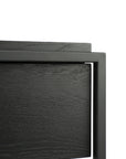 The Monolit Console - Black Oak by Ethnicraft is a modern, minimalist console with two drawers, an open shelf, and a sturdy metal frame. Made from contract grade materials, it features clean lines, a matte finish, and contemporary design.