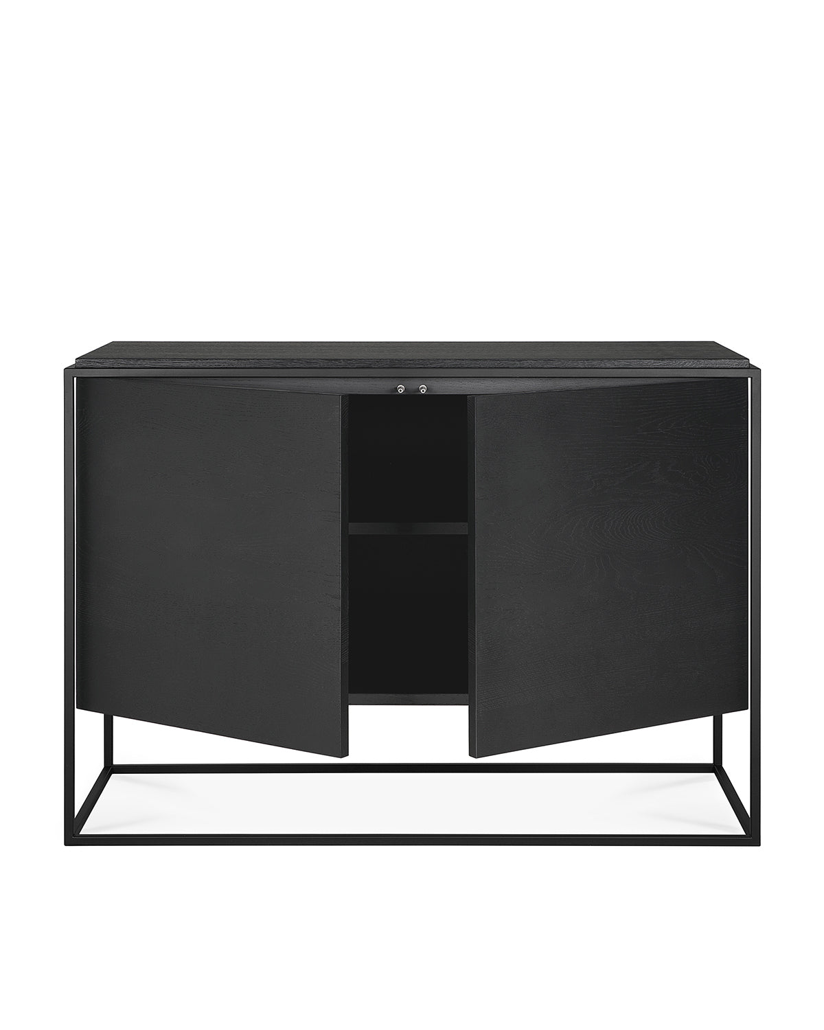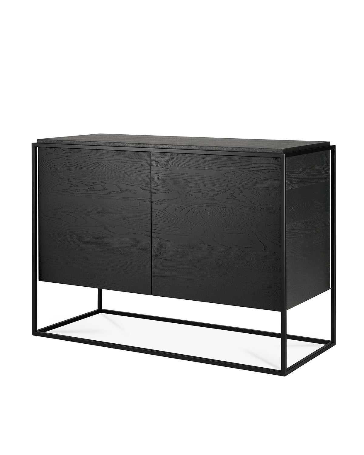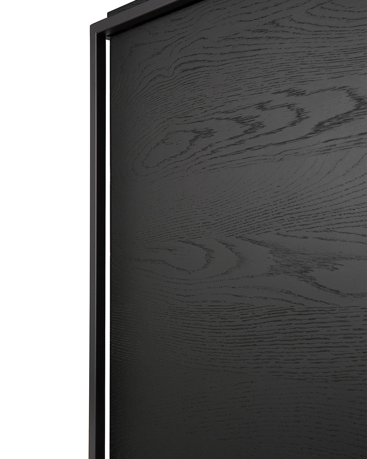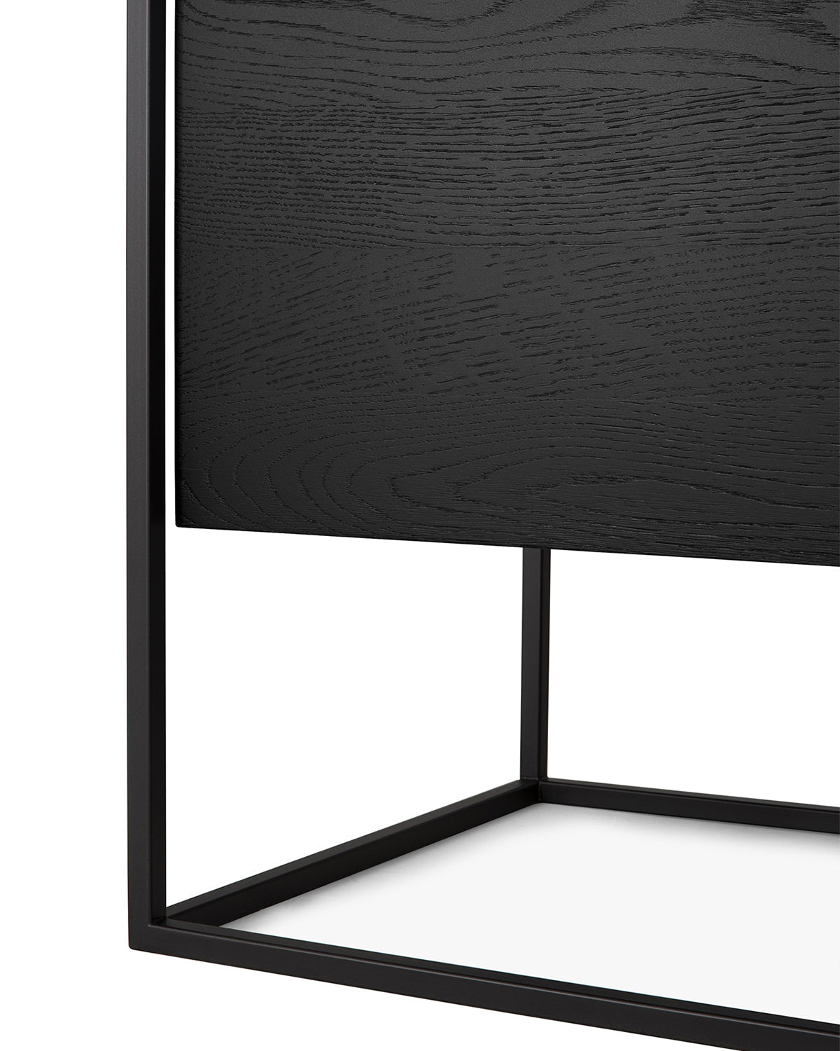 Solid European oak with a black varnished finish for extra protection. Contract grade and suitable for high traffic use. Black metal frame. 2 doors.