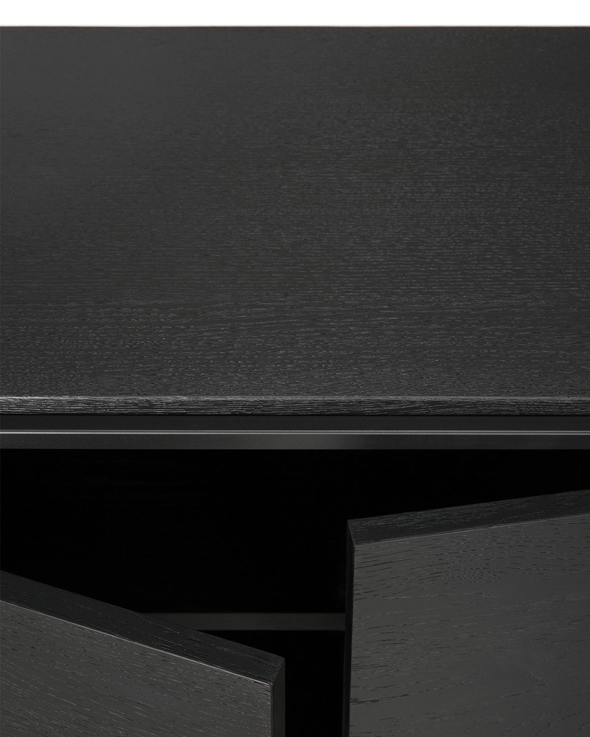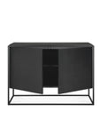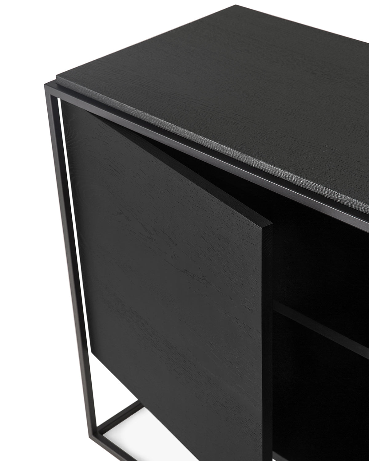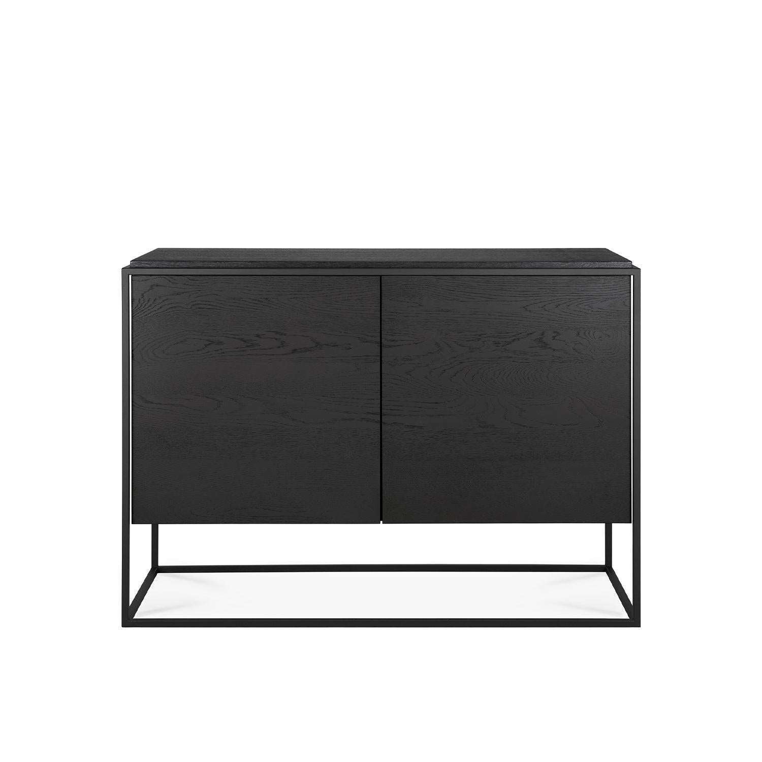 Solid European oak with a black varnished finish for extra protection. Contract grade and suitable for high traffic use. Black metal frame. 2 doors.