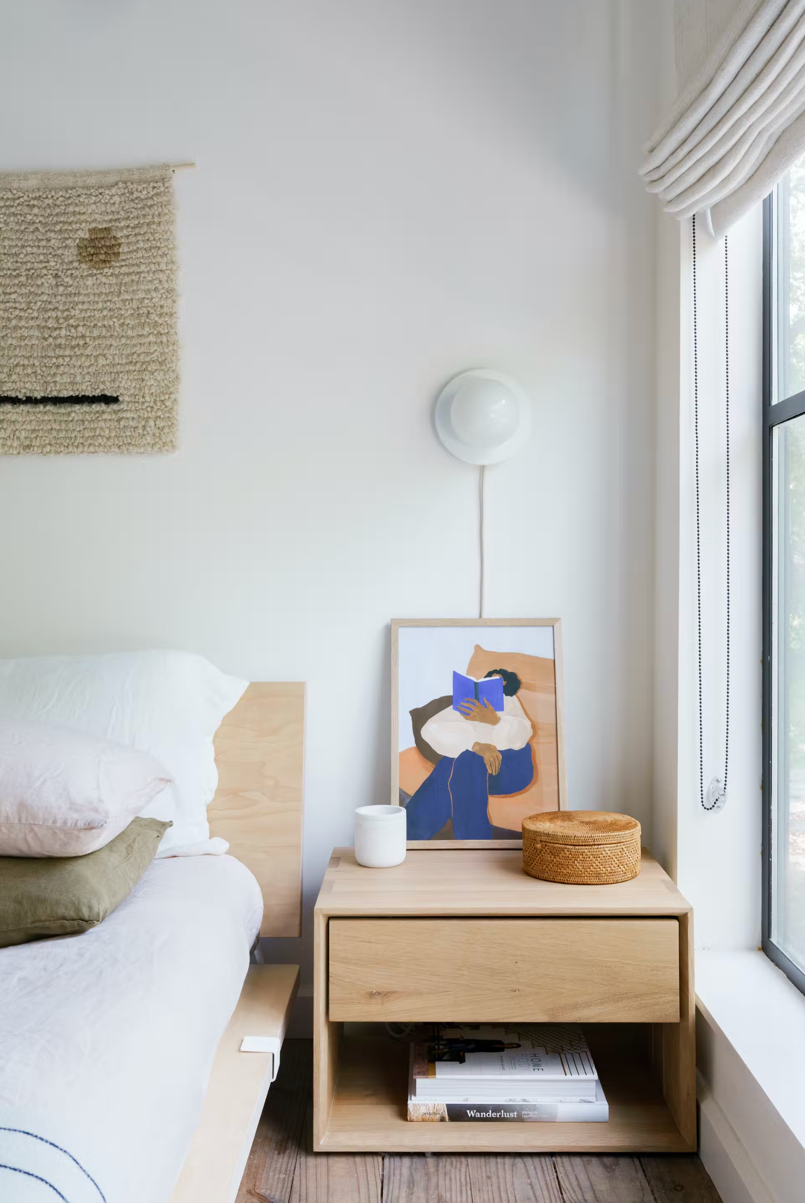 Features one push-open drawer. Made of solid European oak with a hardwax oil finish.