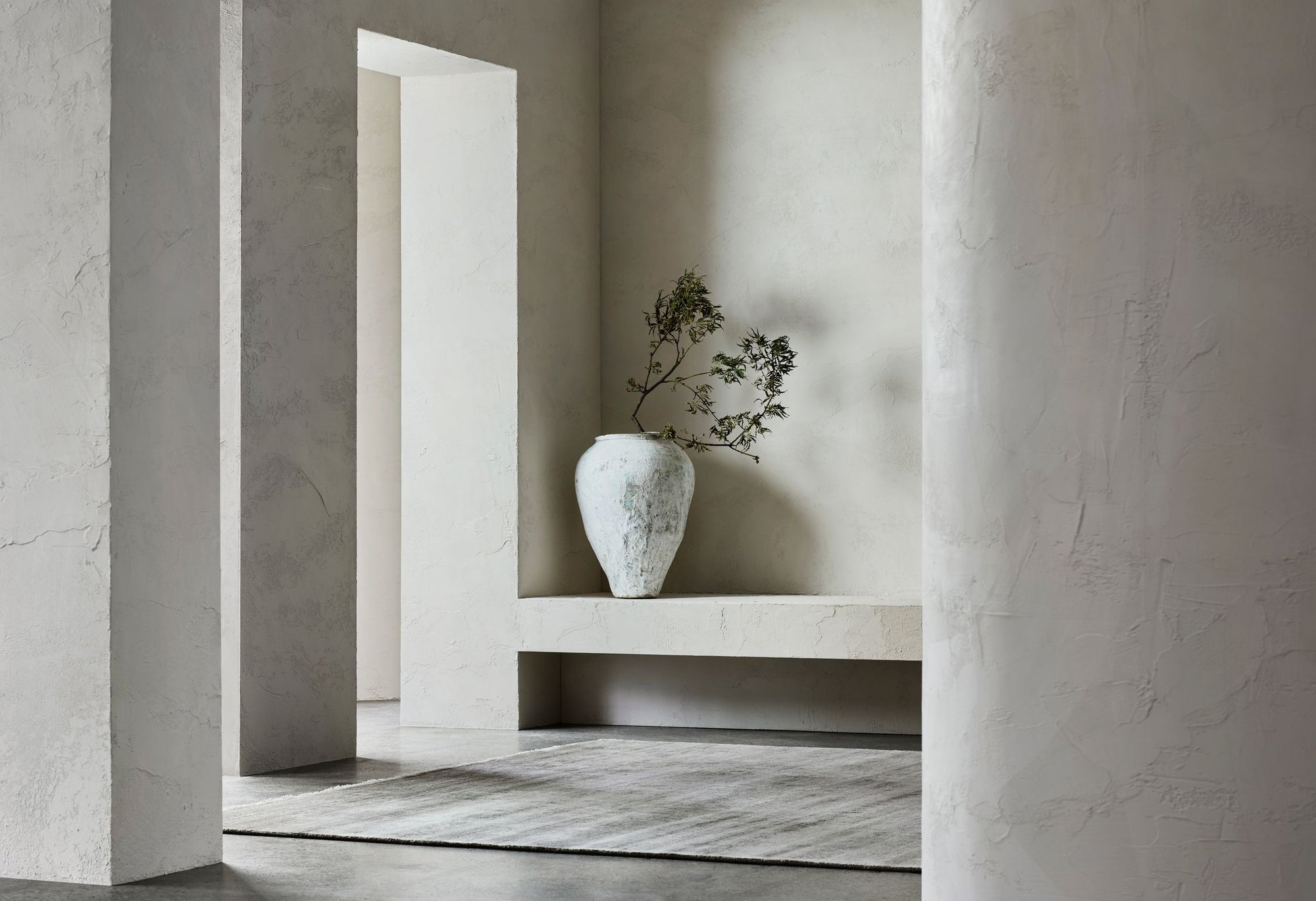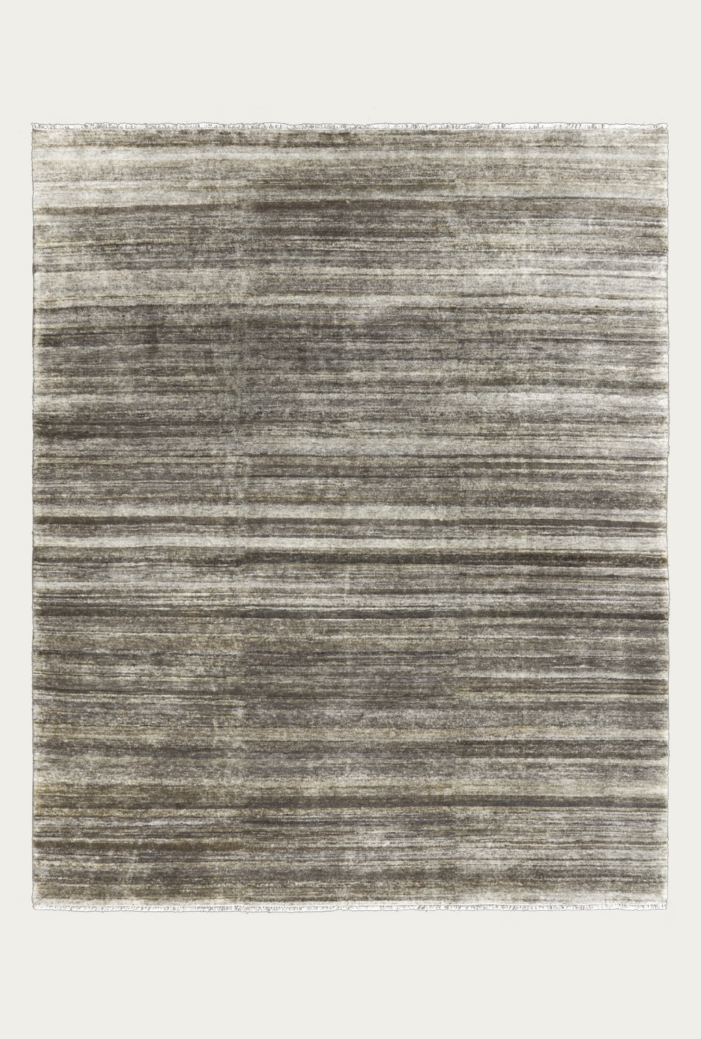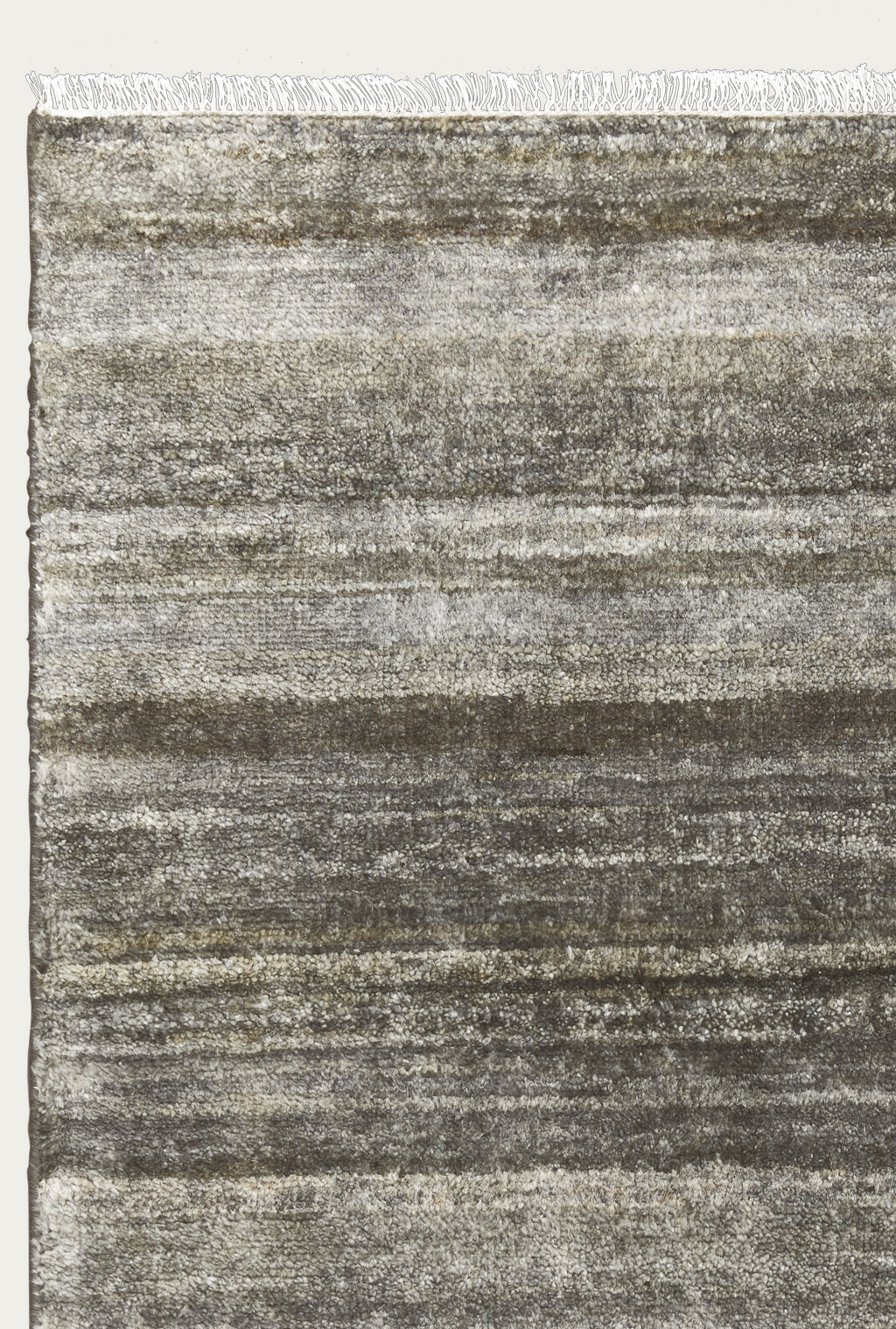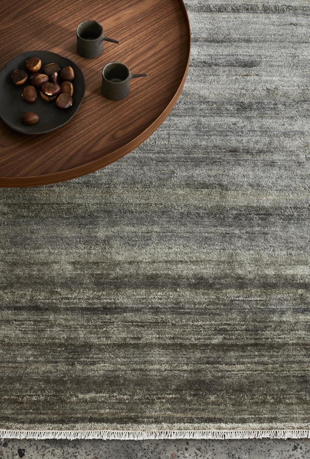 Hand-knotted from soft Afghan wool, this rug’s exquisite palettes and textural intricacies evoke a sensorial calm. No two are exactly the same, as each hank of the natural yarn features mesmerizing striations once solid-dyed and woven into form.