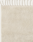 A close-up of the Petra Rug - Blanc by Armadillo&Co shows its beige, fluffy Berber-style texture and soft decorative fringe tassels along one edge, set against a light background.
