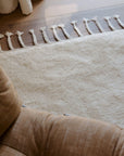 The Petra Rug - Blanc by Armadillo&Co is a rectangular, cream Berber-style rug crafted from soft New Zealand wool with a plush texture and short fringe tassels on the shorter edges.