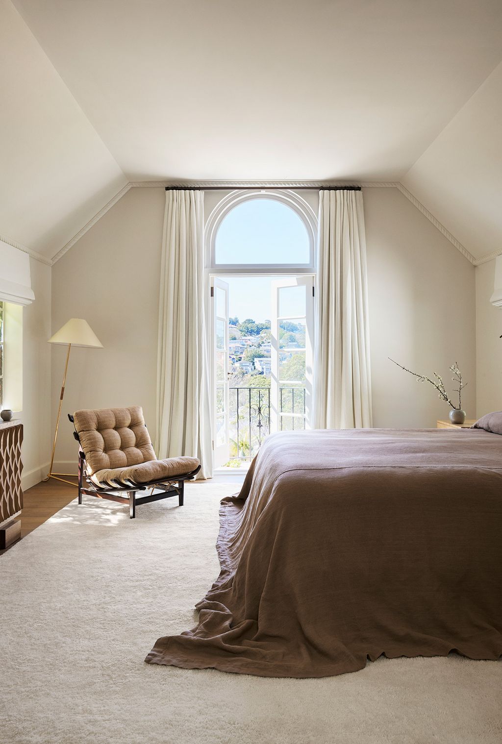 A bright, modern bedroom with a large arched window, white curtains, a cozy chair, beige bedding, and a light floor lamp features neutral tones. The Petra Rug - Blanc by Armadillo&Co adds warmth as you enjoy the lush greenery outside.