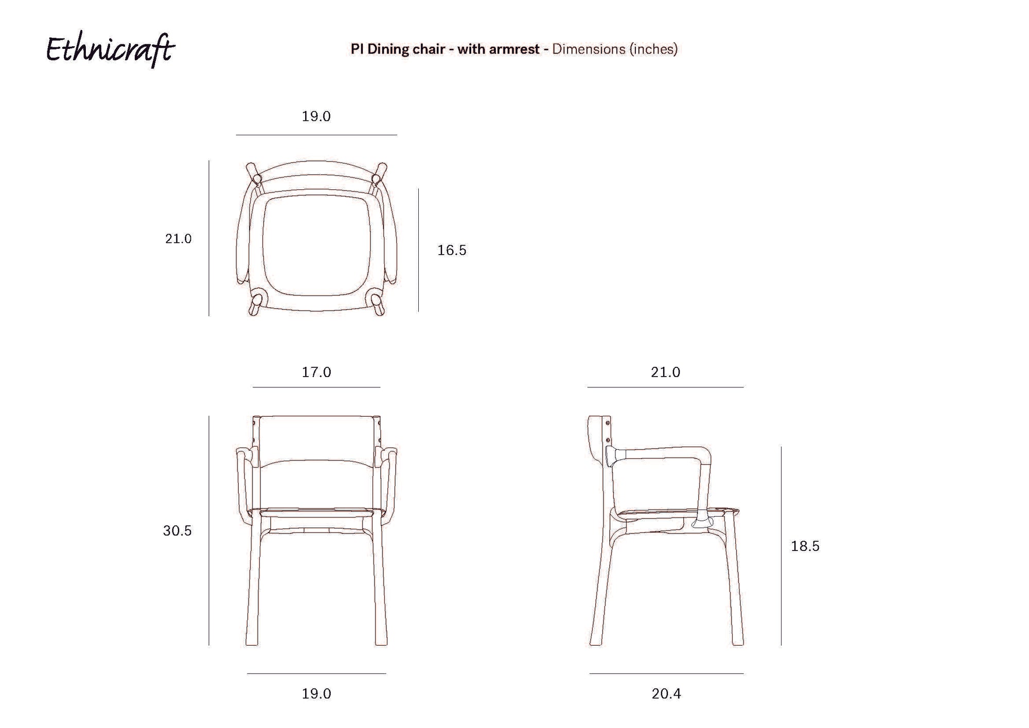 Line drawings of the Ethnicraft PI Dining Chair - Oak with arms, shown from top, front, and side views. Dimensions in inches: W 19 x D 21 x H 30.5; seat height 18.5; armrest height 26.5.