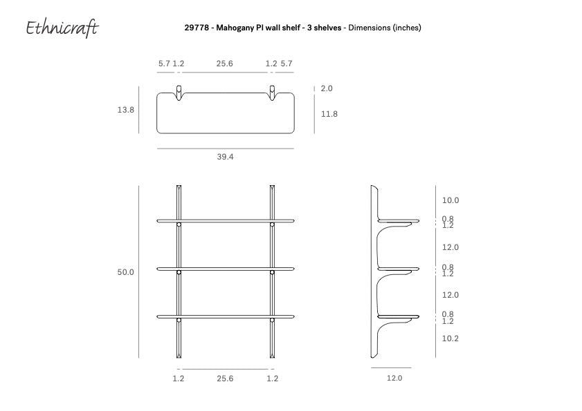 Line drawing of the PI Wall Shelf - Mahogany (3 shelves) by Ethnicraft, showing front, side, and top views with detailed spacing and dimensions in inches—39.4 wide and 12 deep.