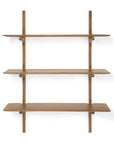 Close-up of Ethnicraft’s PI Wall Shelf - Mahogany (3 shelves), featuring solid mahogany with smooth, rounded edges and a minimalist design, mounted on a white wall.