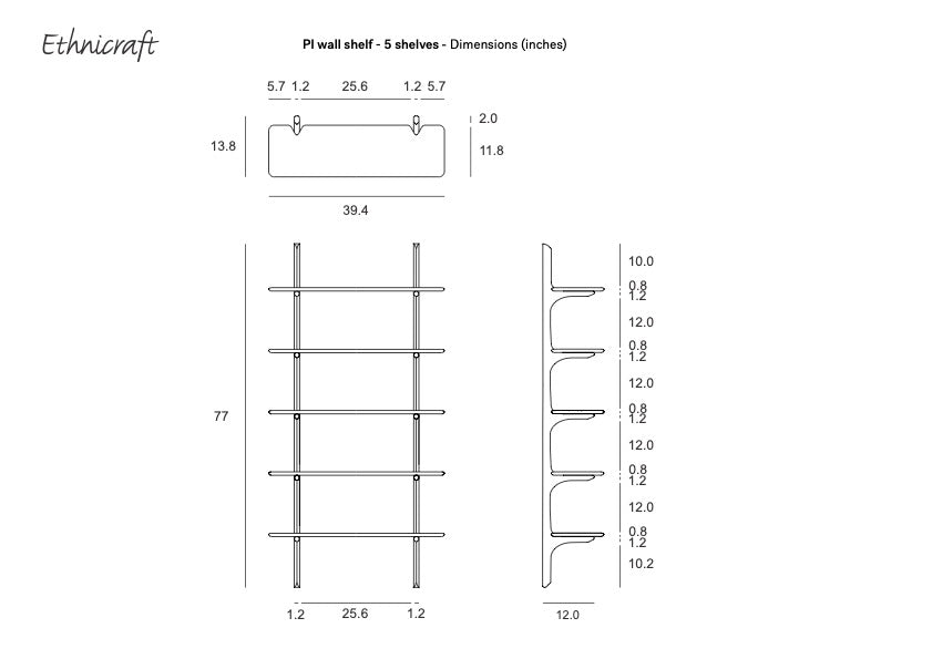 Technical drawing of the Ethnicraft PI Wall Shelf - Oak (5 shelves), displaying front and side views with detailed inch measurements for shelf width, depth, height, and spacing between the 5 solid oak shelves.