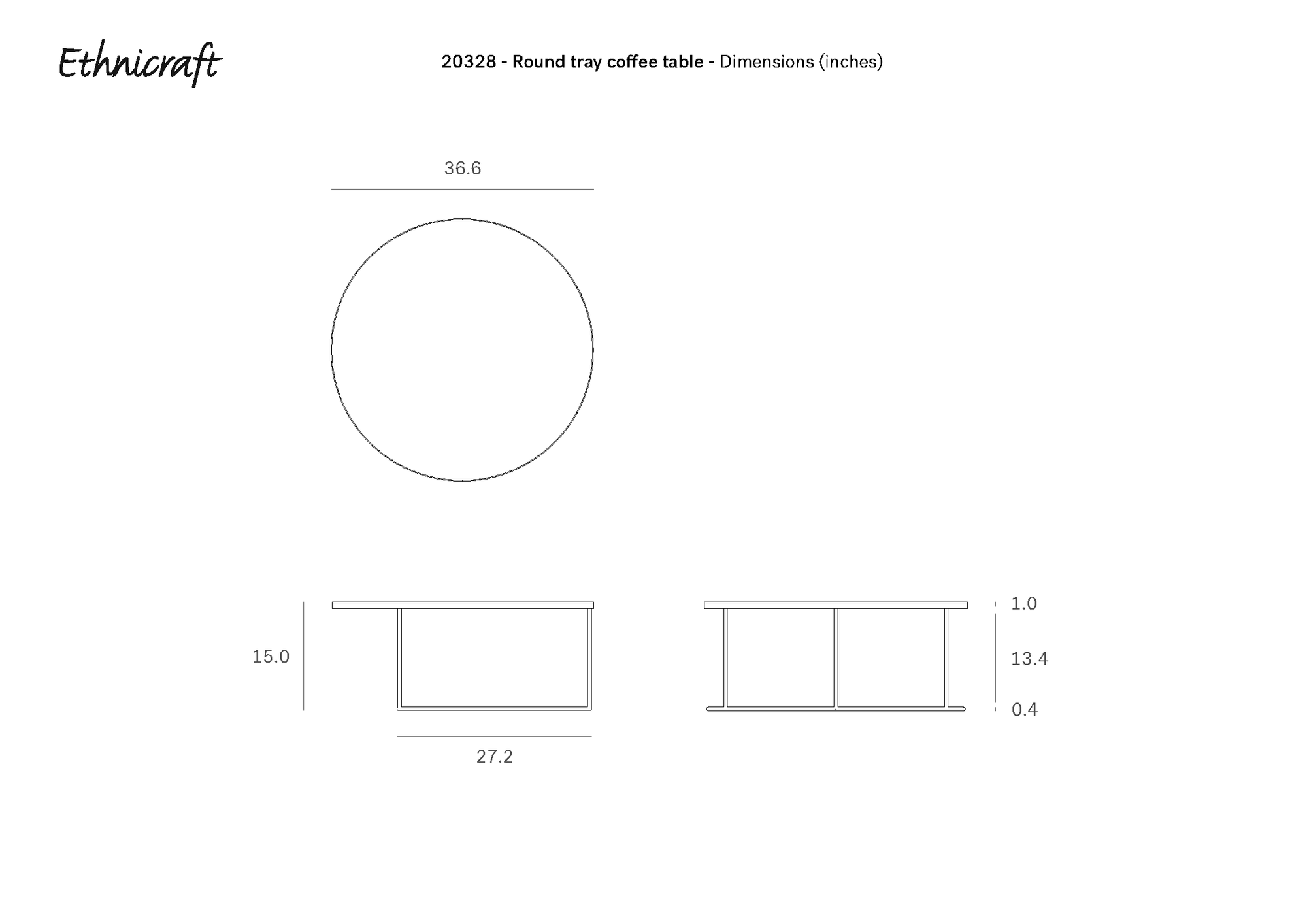 Line drawing of the Ethnicraft Tray Coffee Table, shown in top, side, and front views; features black varnished wood and measures 36.6 diameter, 15 height, 27.2 width. Ethnicraft logo displayed at the top left.