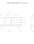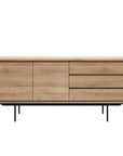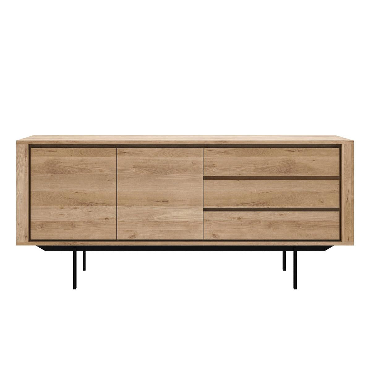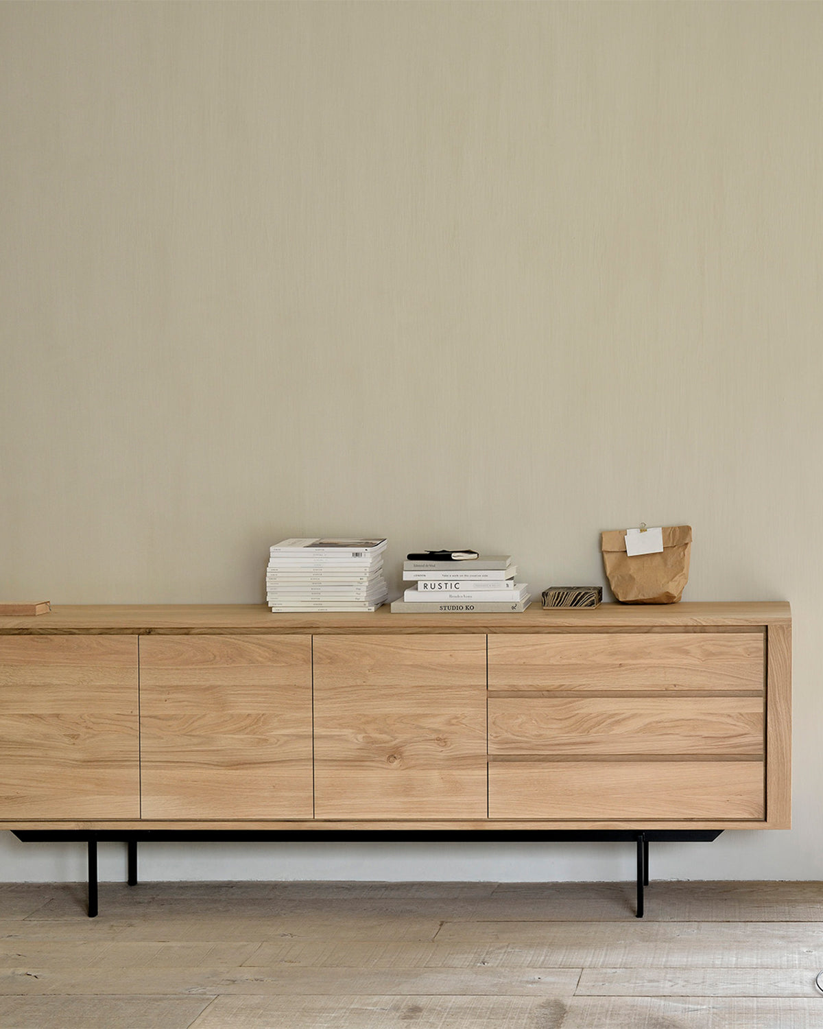 Solid European oak with 2 doors and 3 drawers. Oiled finish. Black metal base.