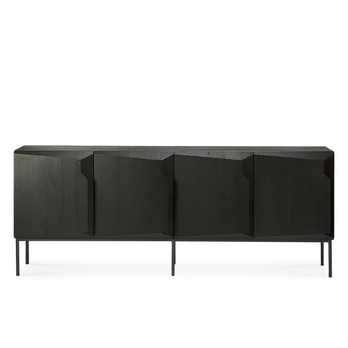 The Ethnicraft Stairs Sideboard - 4 Door is a modern black wooden piece with angular handles, a sleek metal base, and minimalist European oak design, all set against a plain white background.