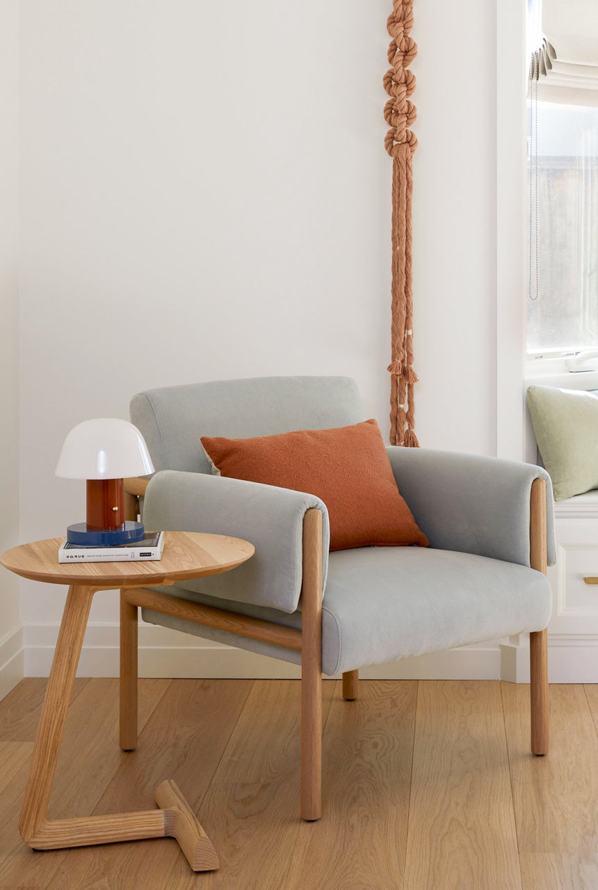 The Teena Side Table's compact design and cantilevered top make it a versatile piece, fitting snugly against your sofa or standing beautifully on its own. Crafted with a solid ash top and base, and a matte poly finish for durability.