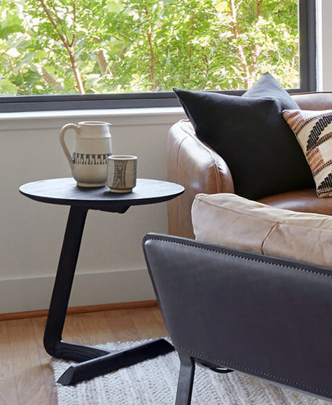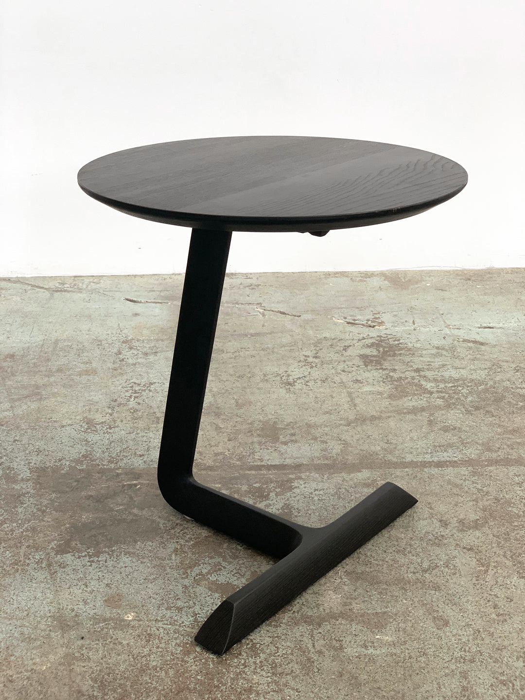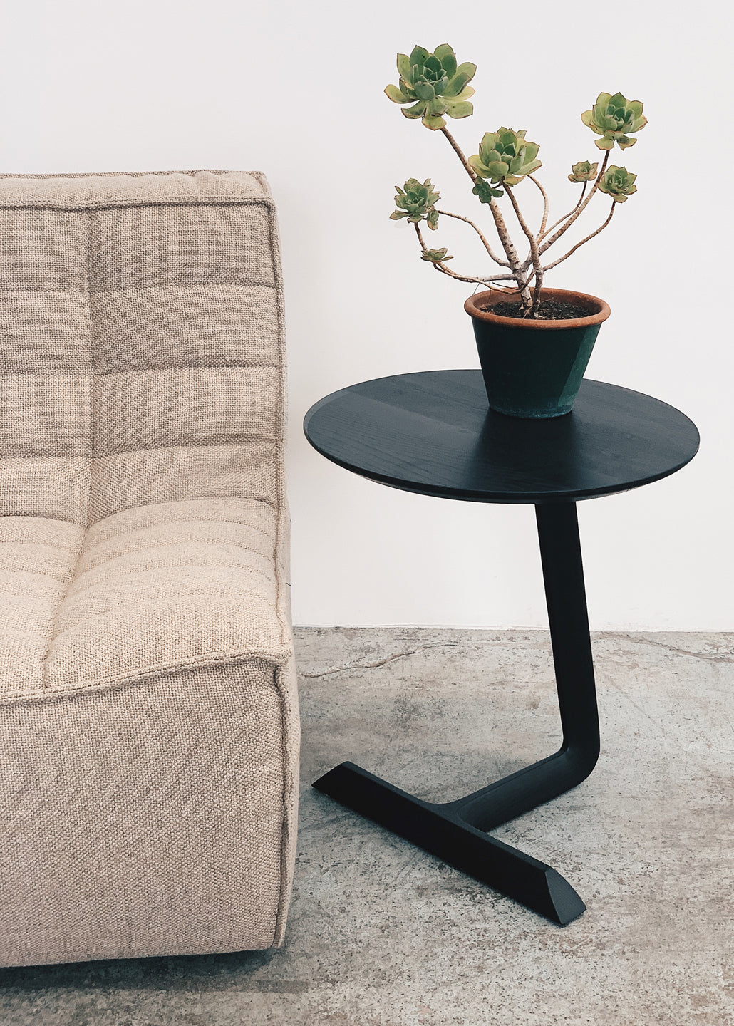 The Teena Side Table's compact design and cantilevered top make it a versatile piece, fitting snugly against your sofa or standing beautifully on its own. Crafted with a solid black-stained ash top and base, and a matte poly finish for durability.