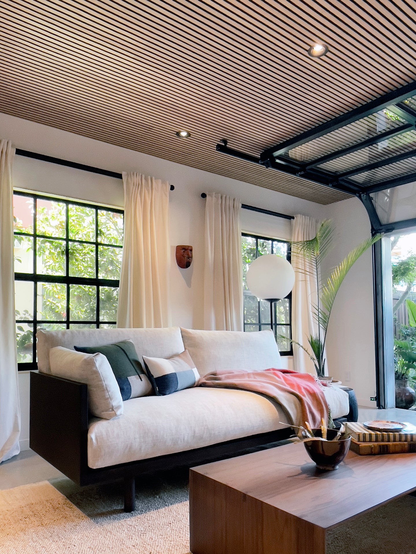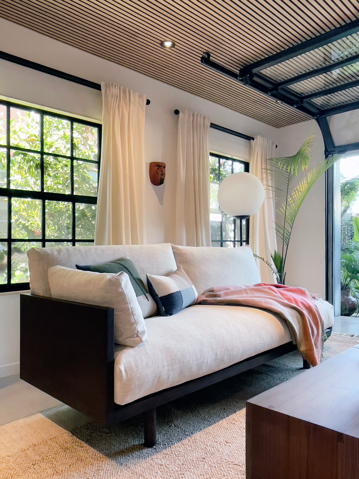 A modern living room featuring the SOBU Woody Sofa (One Arm) in Espresso Ash and Fog, accented with black and white pillows, a pink throw blanket, a wood coffee table, white curtains, large windows, slatted wood ceiling, and green plants with outdoor views.
