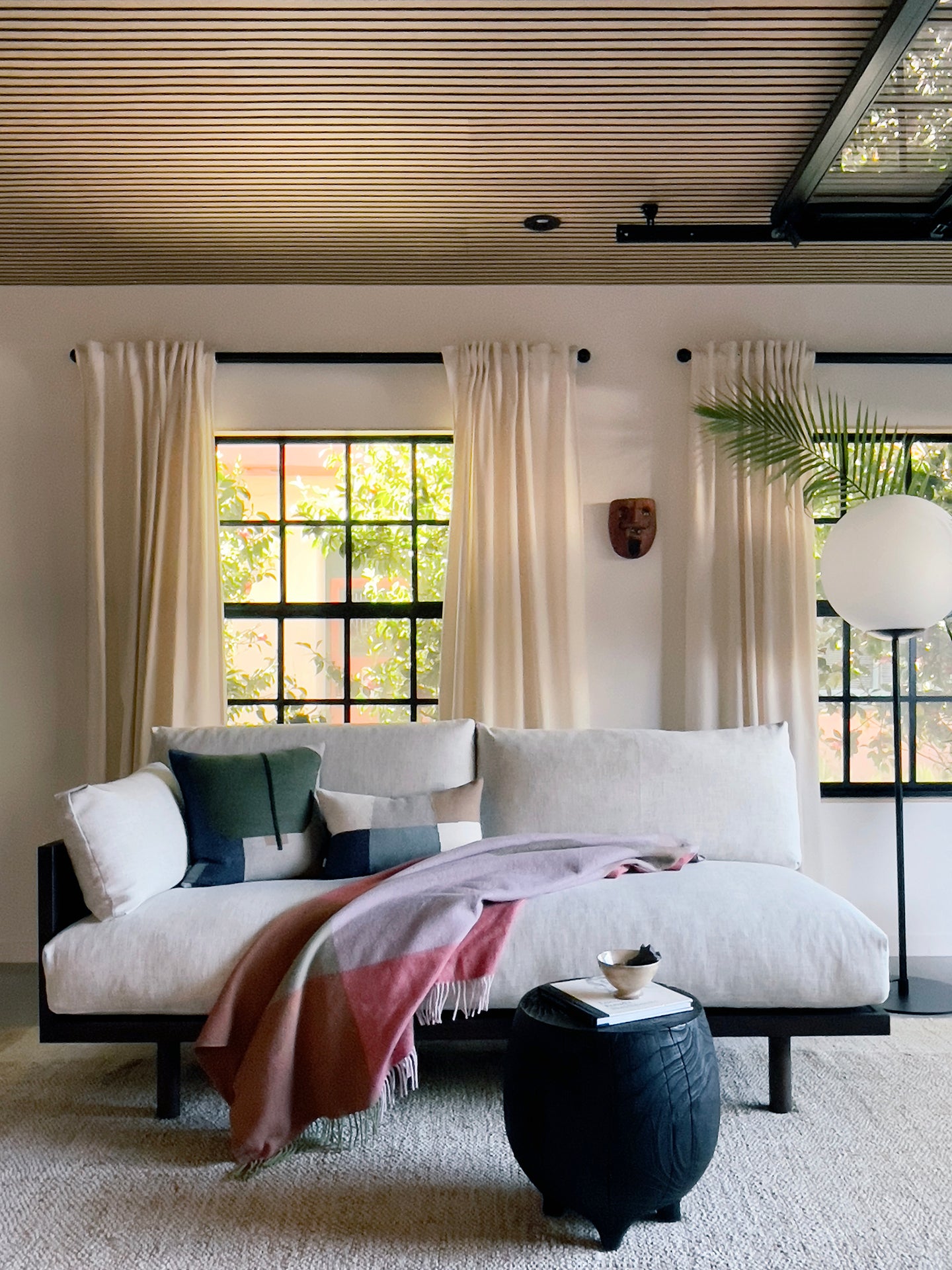 A modern living room featuring the SOBU Woody Sofa (One Arm) in Espresso Ash and Fog, decorated with pillows, a pink throw blanket, tall cream curtains, large windows, a round floor lamp, potted plant, and wood slat ceiling accents.