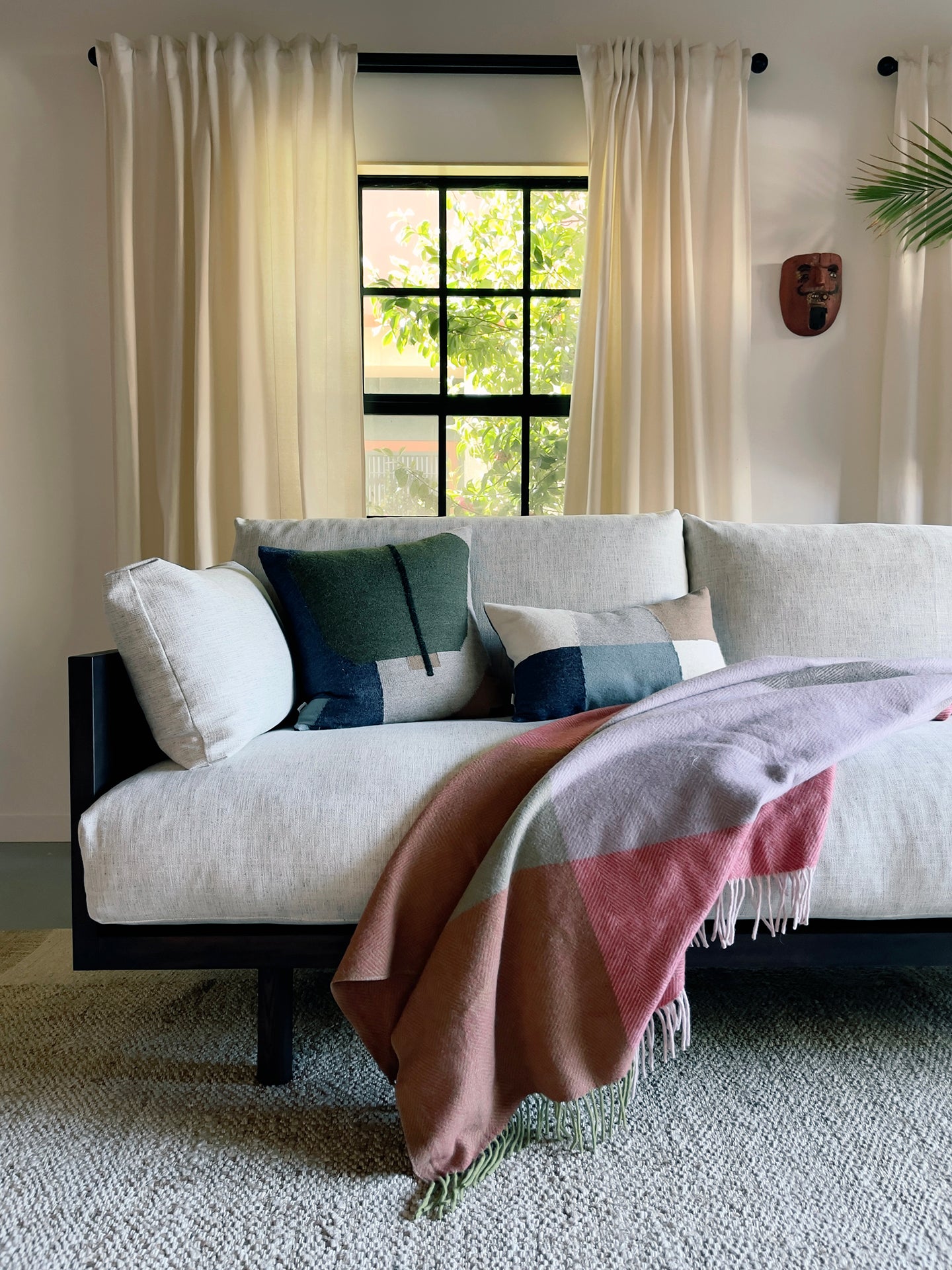 A modern living room with the SOBU Woody Sofa (One Arm) in Espresso Ash and Fog, adorned with decorative pillows and a pink-beige throw. Cream curtains frame a window with black grid panes as sunlight and greenery filter in over a textured rug.