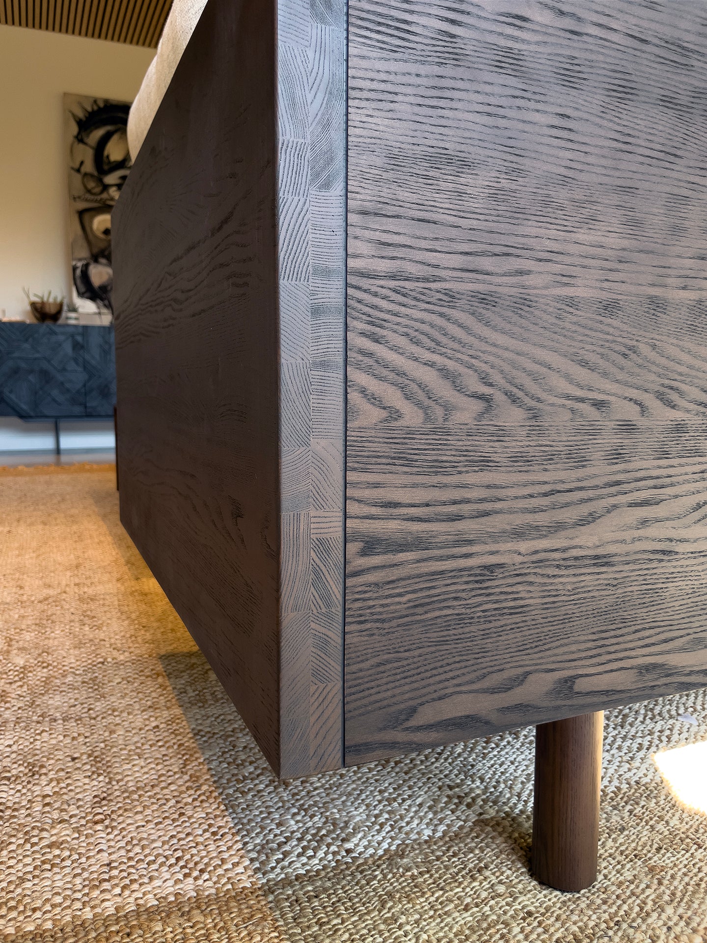 Close-up of a modern wooden sideboard with visible wood grain, next to the SOBU Woody Sofa (One Arm) in Espresso Ash and Fog. Set on a woven beige rug in a contemporary space with blurred artwork and furniture in the background.