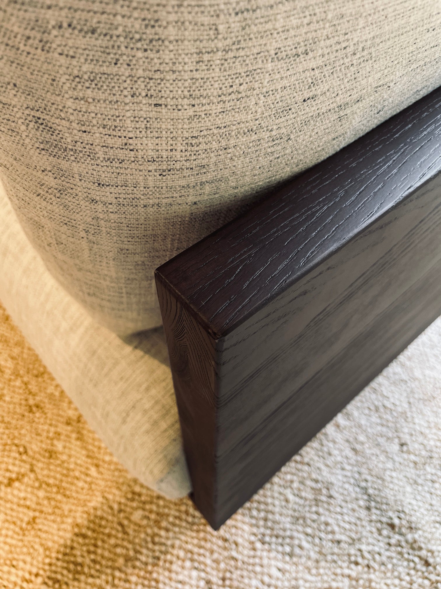 Close-up of SOBU's Woody Sofa (One Arm) in Espresso Ash and Fog, featuring a light beige cotton linen cushion beside its dark ash wood armrest, with a woven beige carpet underneath.