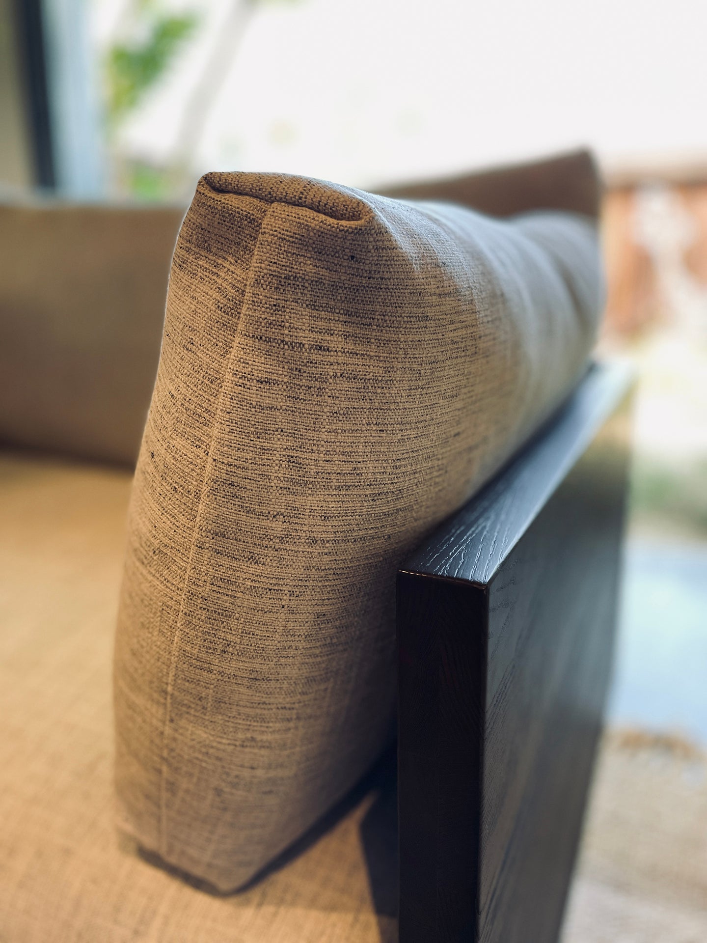 Close-up of a SOBU Woody Sofa (One Arm) in Espresso Ash and Fog, showing a beige cotton linen cushion against a solid ash wood armrest, with soft natural light in the blurred indoor background.