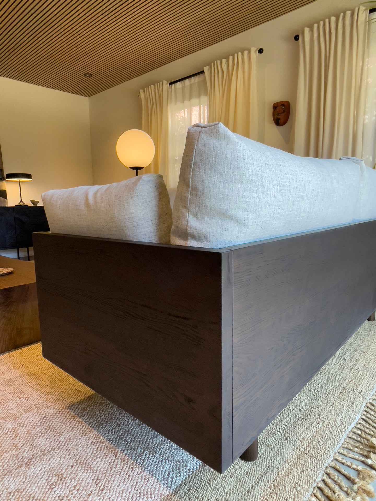 A close-up of the SOBU Woody Sofa (One Arm) in Espresso Ash and Fog, highlighted in a cozy living room with cream curtains, a textured rug, a round floor lamp, and a wood-paneled ceiling.
