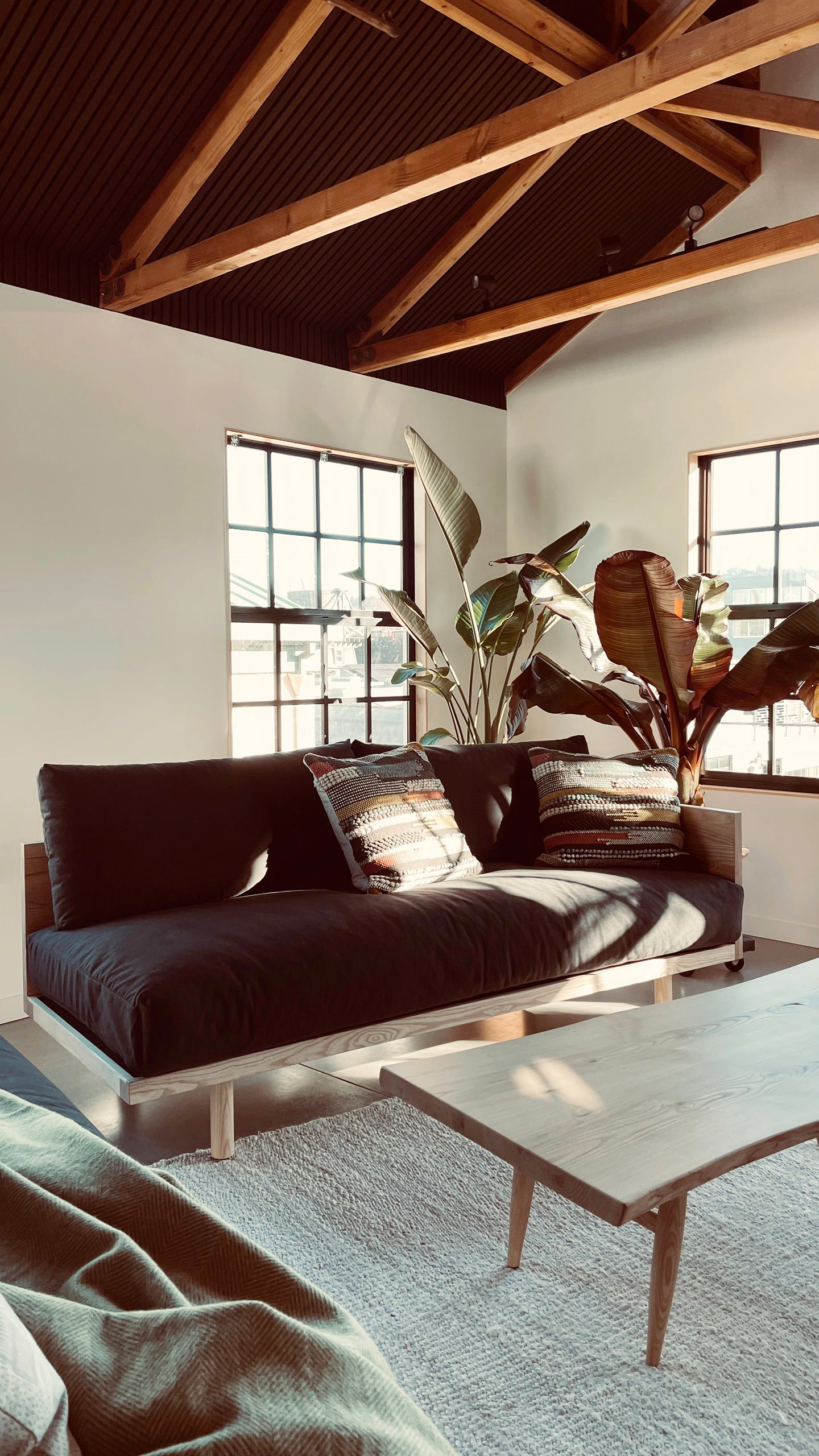 A modern living room with the SOBU Woody Sofa (One Arm) in white ash and charcoal, patterned cushions, lush green plants, a wood coffee table, light rug, white walls, and exposed ceiling beams illuminated by sunlight.