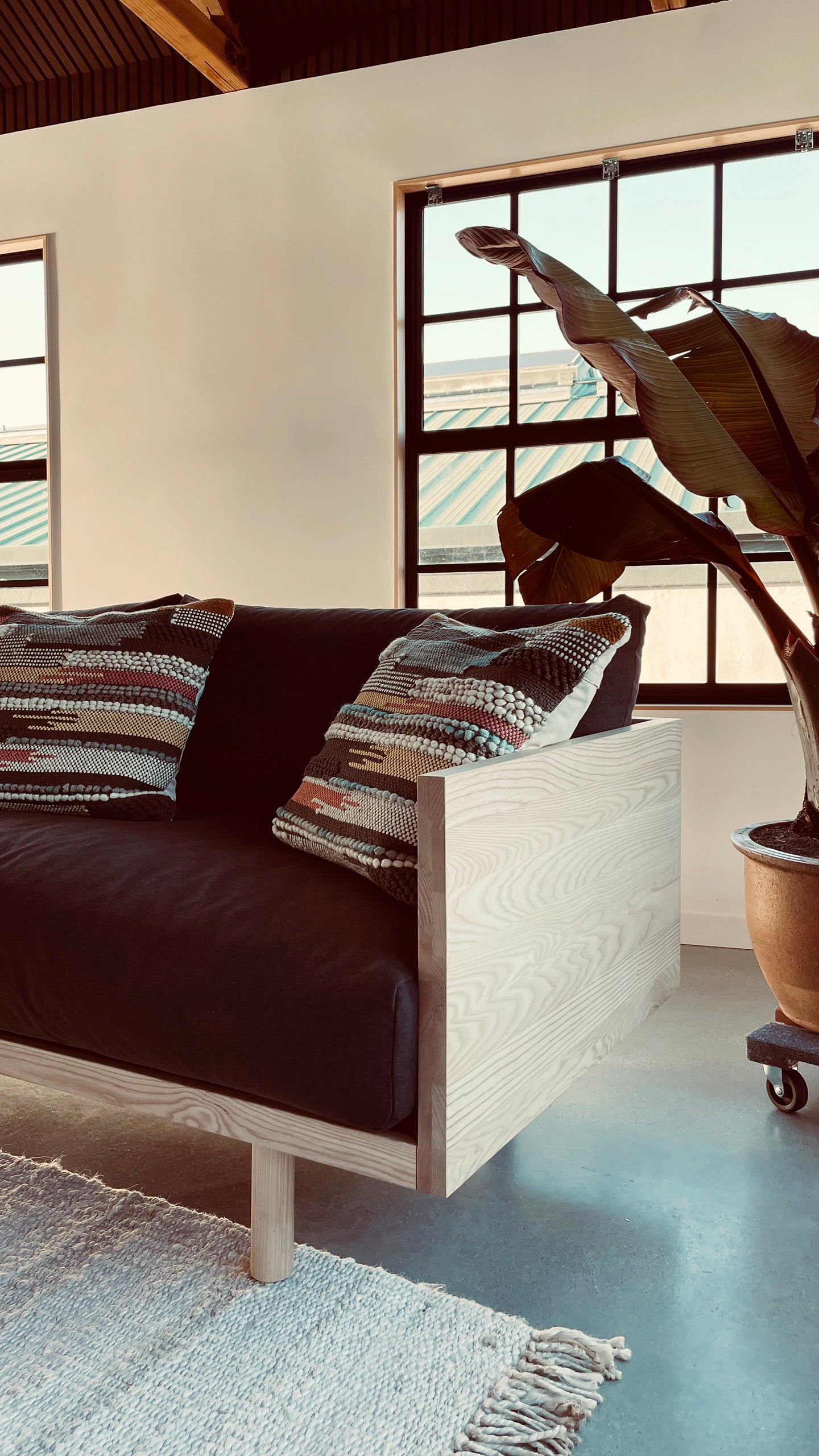 A relaxed and inviting design with a deep profile and gorgeous solid ash wood frame. Remove back cushions and your sofa is transformed to a twin bed (fits Twin XL sheets). This model has one arm only for a more inviting and open feel depending on how it is situated in your space.