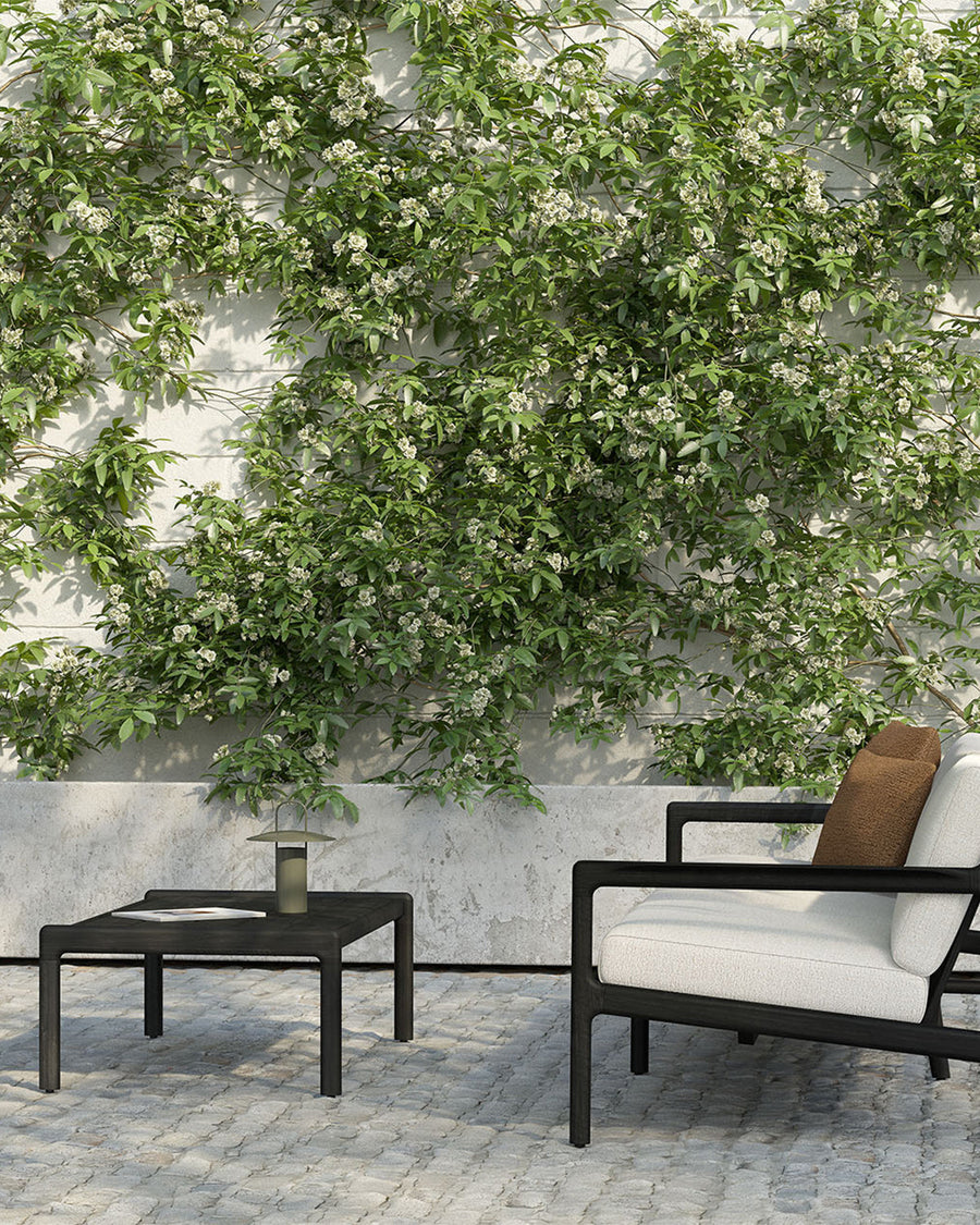 A modern patio showcases a white cushioned chair, black-framed Ethnicraft teak furniture, the Jack Outdoor Coffee Table in black teak with a glass and candle, and a green vine climbing a white wall in the background.