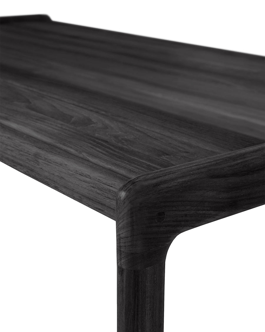 Close-up of the corner of the Jack Outdoor Coffee Table in black teak by Ethnicraft, featuring rounded edges and a smooth finish, set against a white background.
