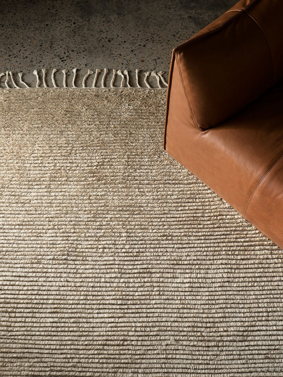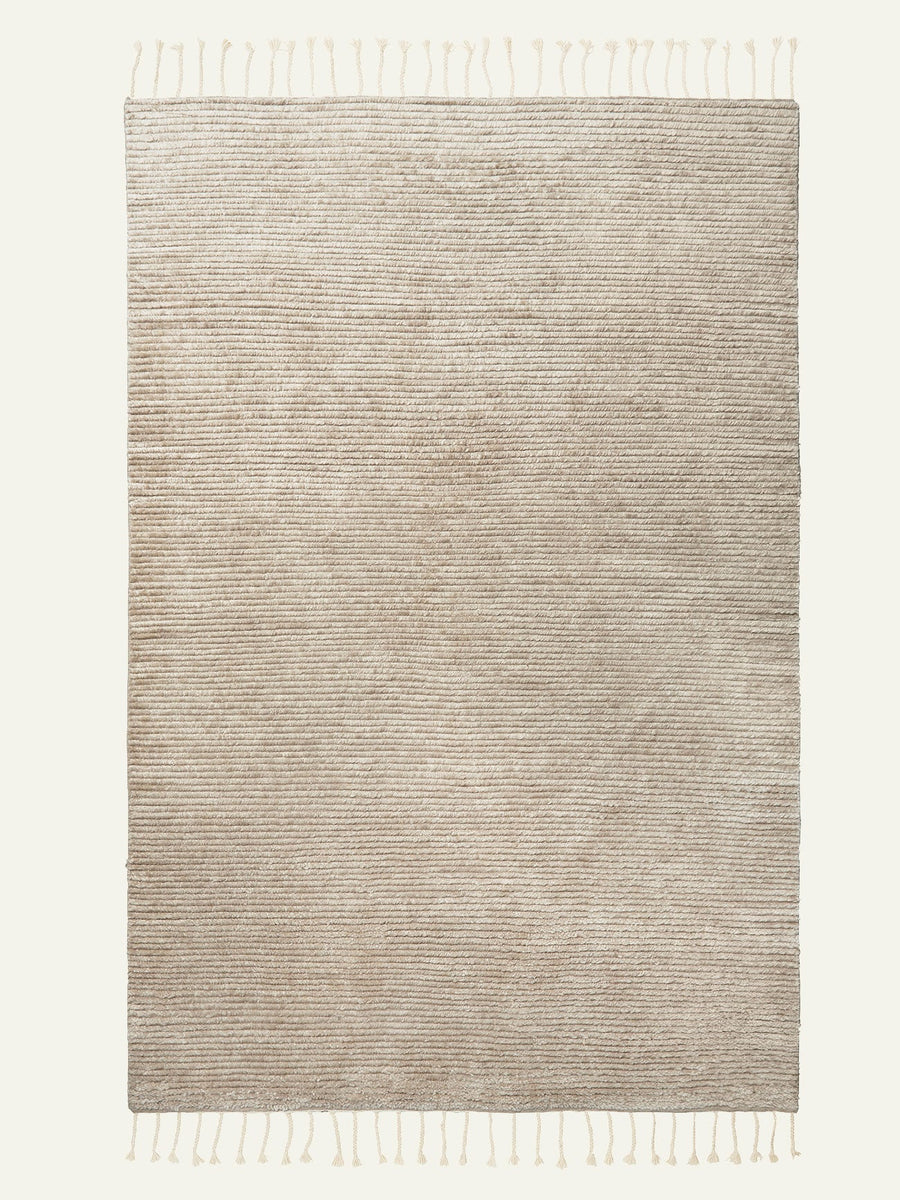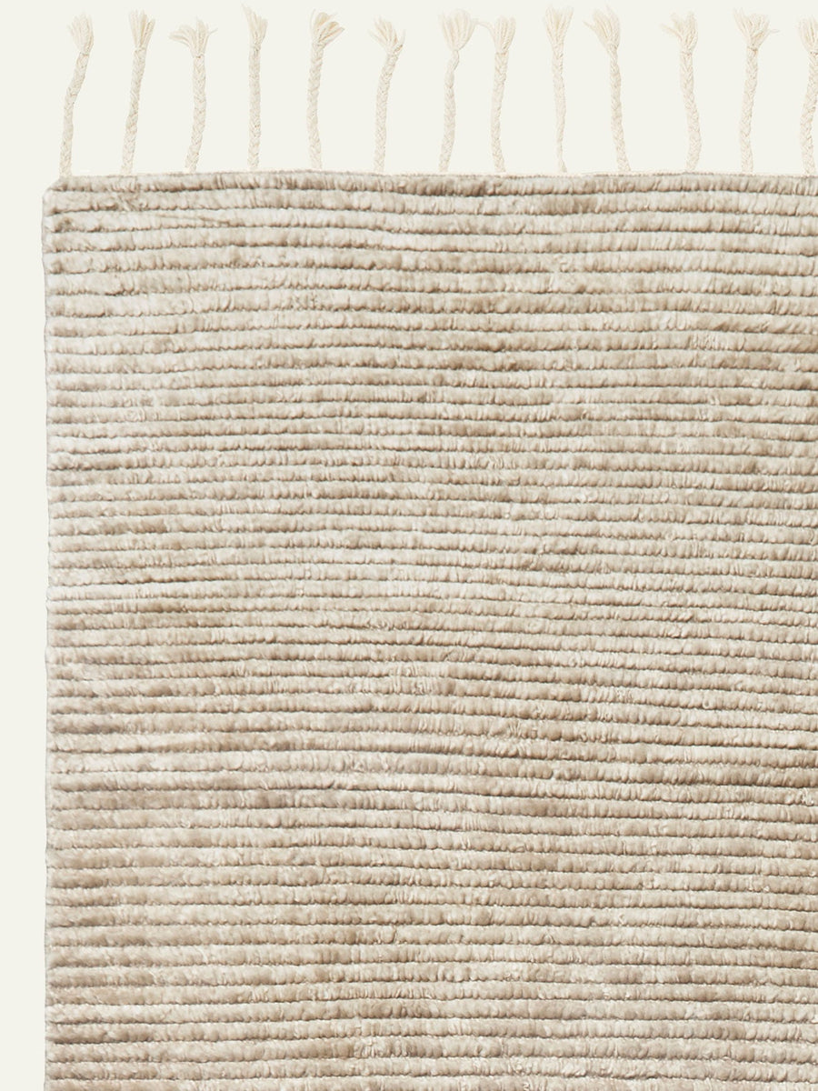 Malawi evokes novelty and nostalgia with rows of hand-knotted wool framed by a tasseled fringe. The ribbed pile, now an undulating canvas for painterly hues, has an artisanal feel designed to bloom and blend with time. Delightfully soft and supple, this beloved style oozes barefoot comfort.