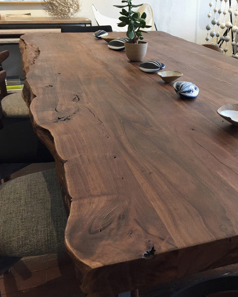 A SOBU favorite, featuring a stunning live edge acacia top and your choice of satin black steel t-legs, antique brass steel t-legs or curved gunmetal grey steel legs. Each piece is one-of-a-kind, showcasing rich grain and natural character, and sealed with a matte, water-based lacquer for durability—ideal for family life.