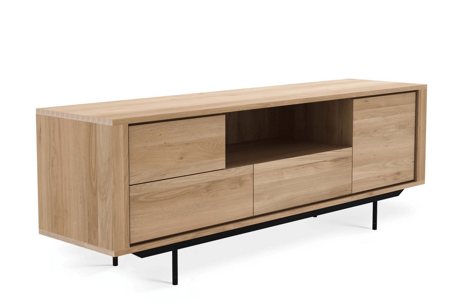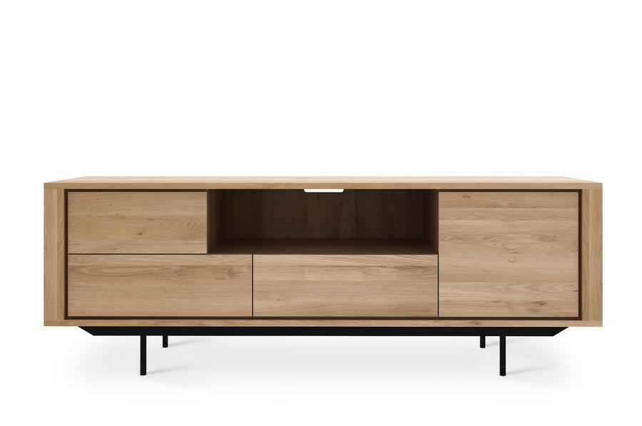 Solid European oak with an oiled finish and black powder coated metal legs. 4 doors and 2 drawers.